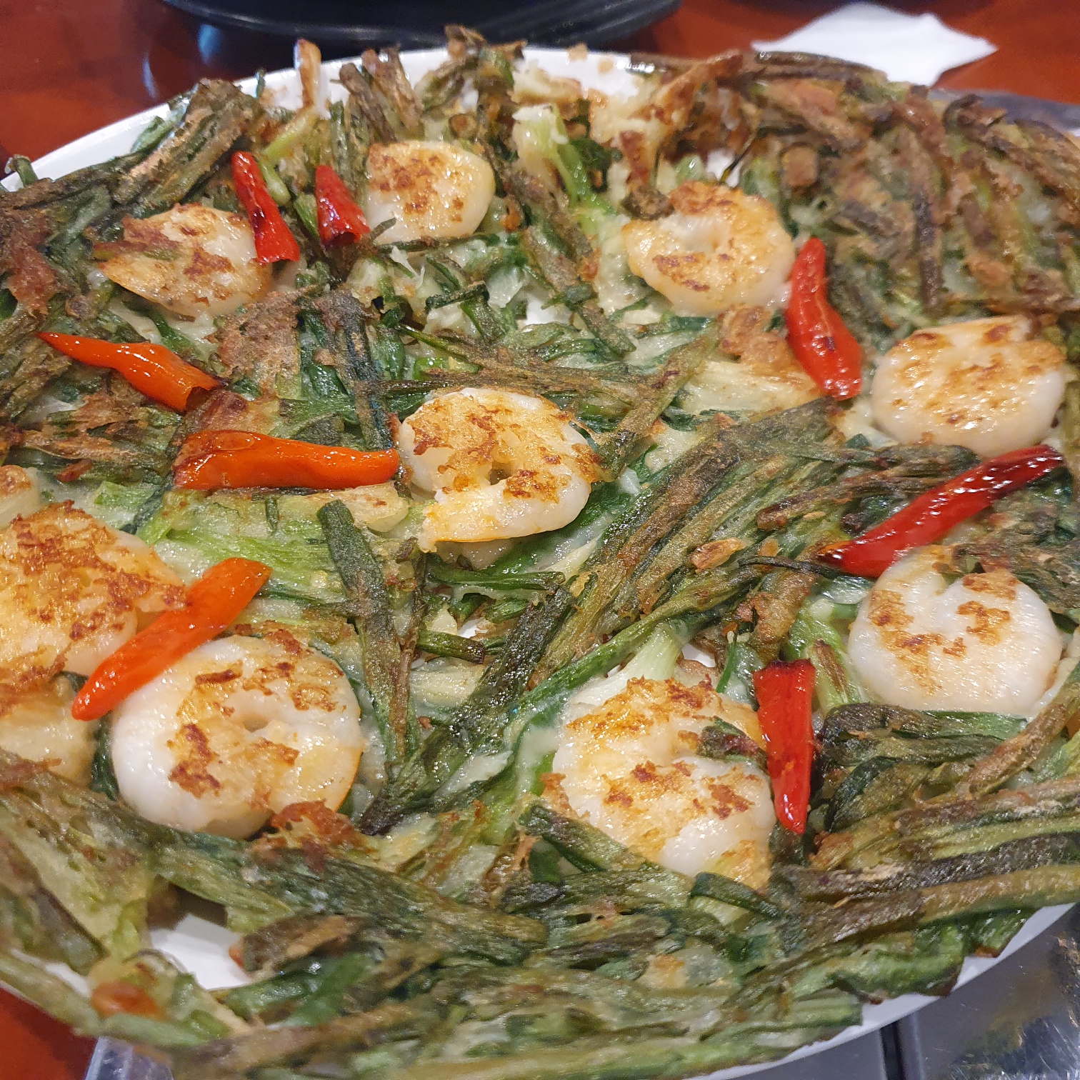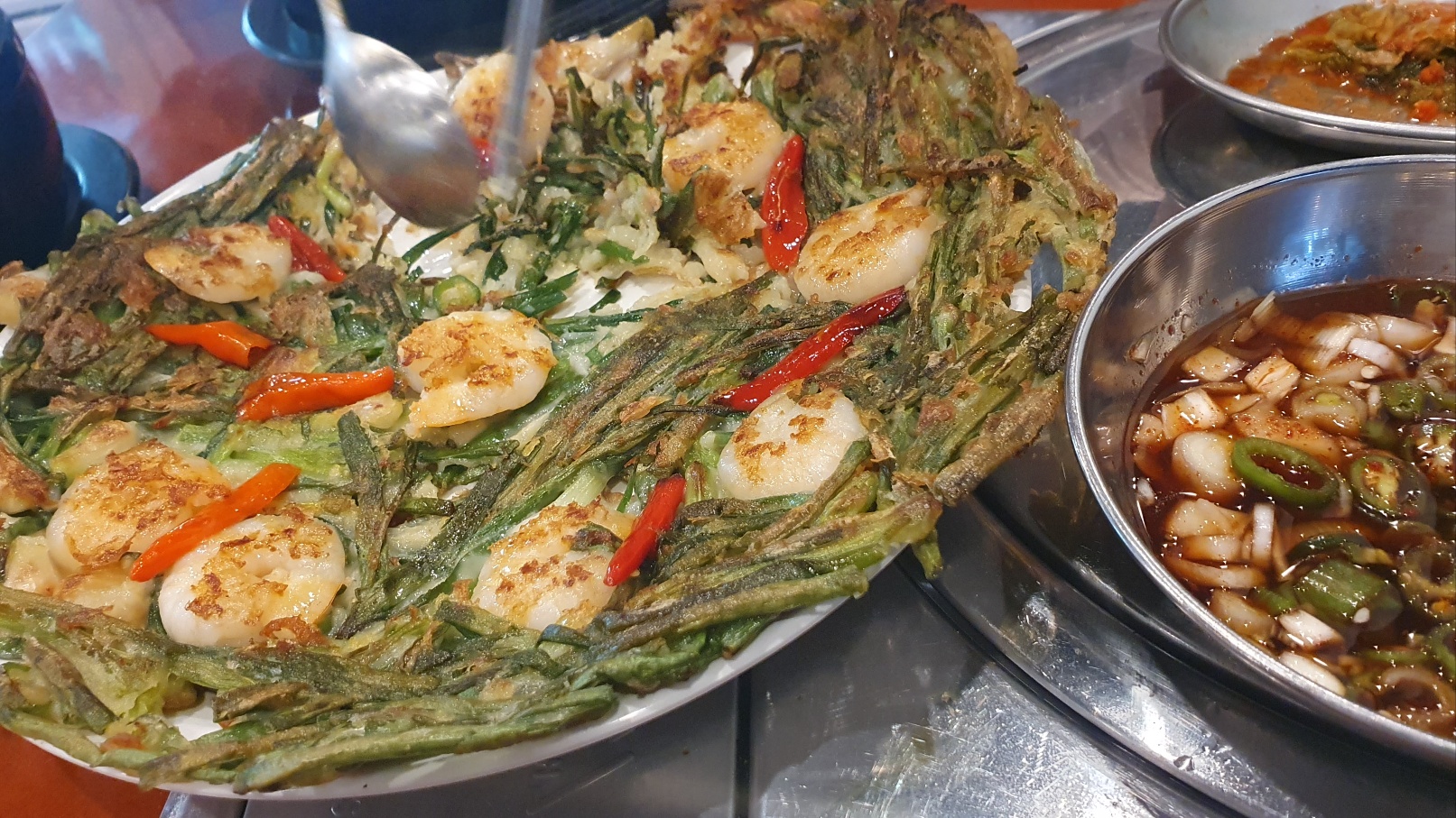 큰 쟁반에 노릇하게 잘 익혀 나온 왕새우전 입니다. 전 안에 들어있는 새우가 토실토실해서 입에서 씹을 때마다 팡팡~ 터지는 식감이 참 좋았습니다.