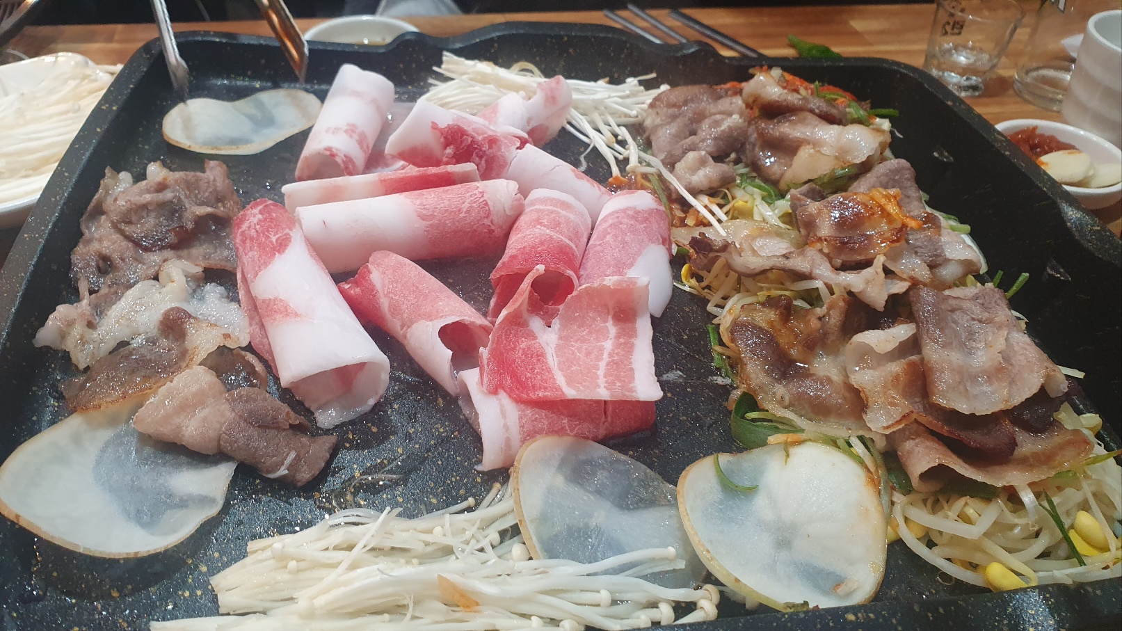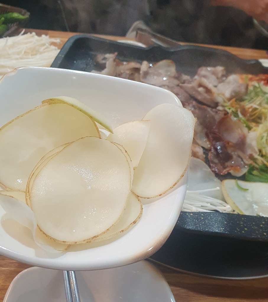 셀프바에 준비된 찬들을 그릇에 채워왔습니다. 양파지와 장아찌도 있었지만 저희는 불판 위에 고기랑 함께 구워 먹을 수 있는 재료들로 알뜰히 챙겨 왔답니다.