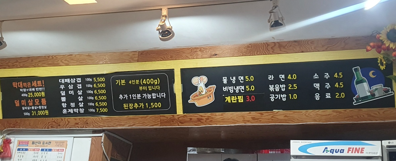 고기 메뉴 이외의 메뉴도 있습니다. 사이드 메뉴로는 물냉면, 비빔냉면, 라면, 볶음밥, 계란찜이 있습니다.
