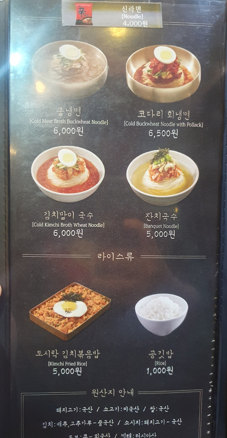 냉면과 볶음밥, 소세지, 구워 먹는 치즈까지 있어요.