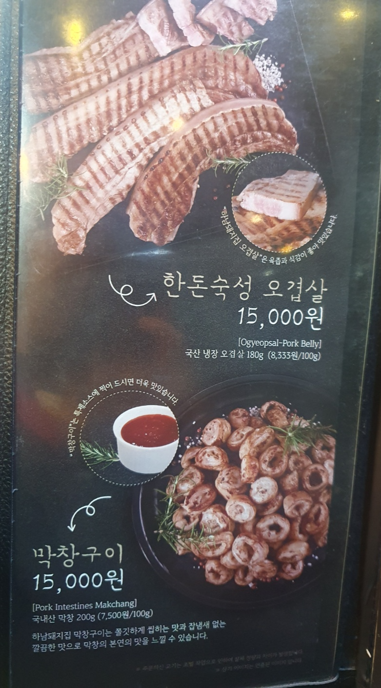 하남돼지집 노은점에서는 기본 삼겹살, 오겹살, 갈매기살, 가브리살, 목살, 막창구이 등등