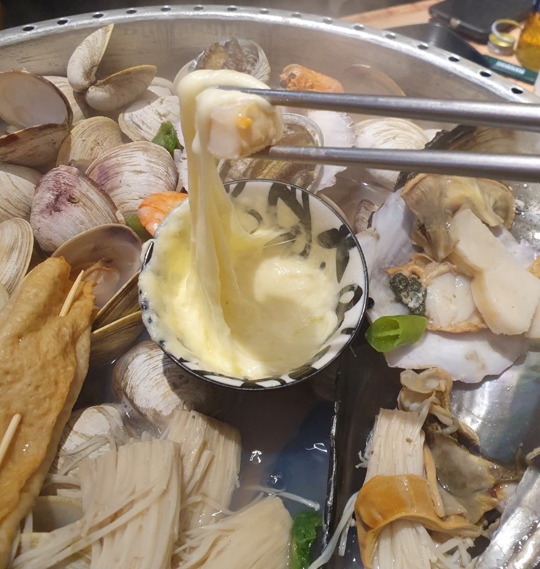 찜통 가운데에는 치즈가 담긴 그릇이 있는데 조개와 함께 먹으면 정말 조합이 훌륭합니다. 부족하신 분들은 추가로 주문이 가능합니다.