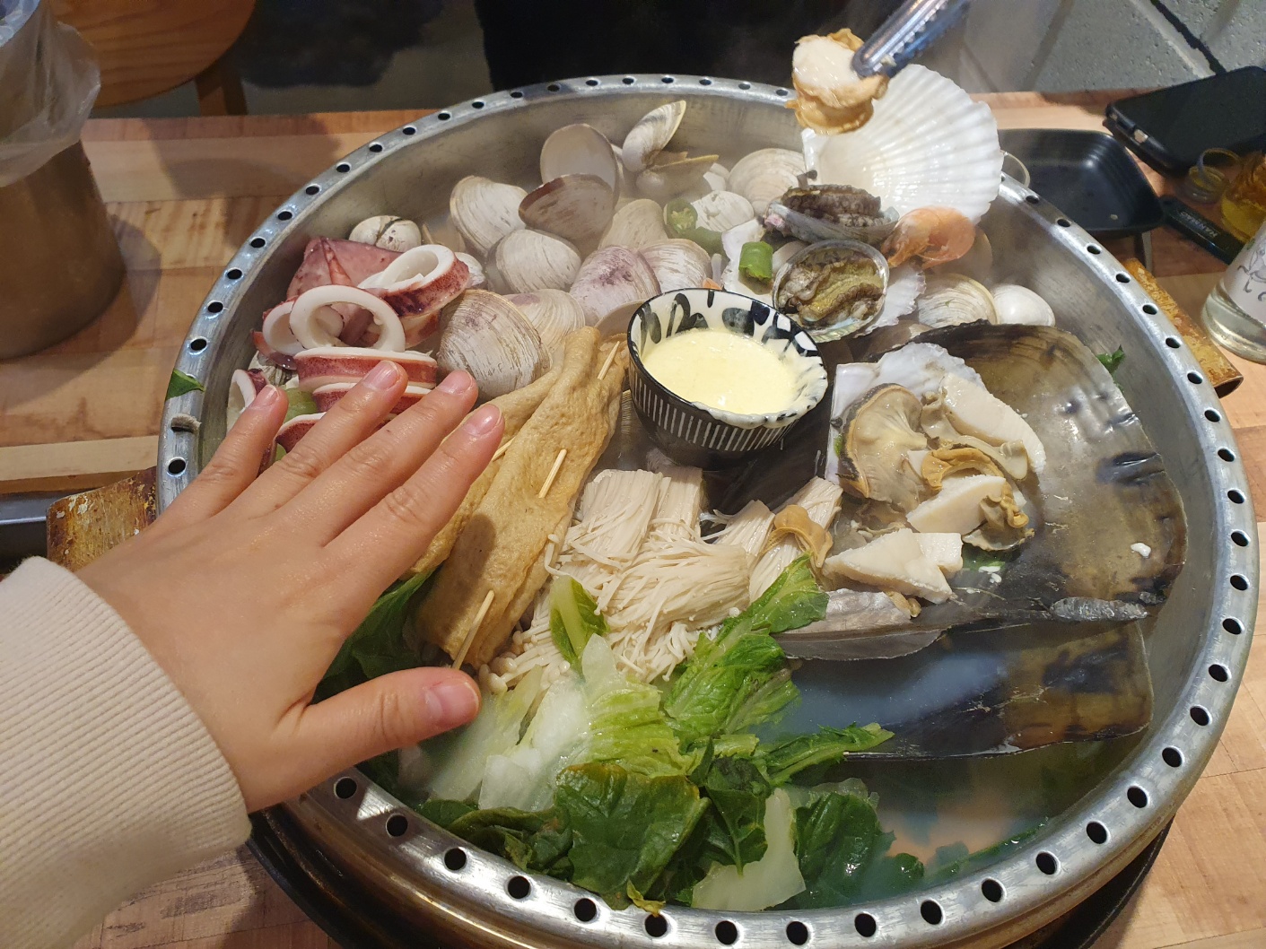 1~2인 미니 사이즈라기엔 많이 사이즈가 큽니다. 사장님께서 오징어를 먹기좋은 사이즈로 잘라주셨습니다. 키조개랑 가리비 먼저 먹으라고 하셔서 바로 냠냠~!