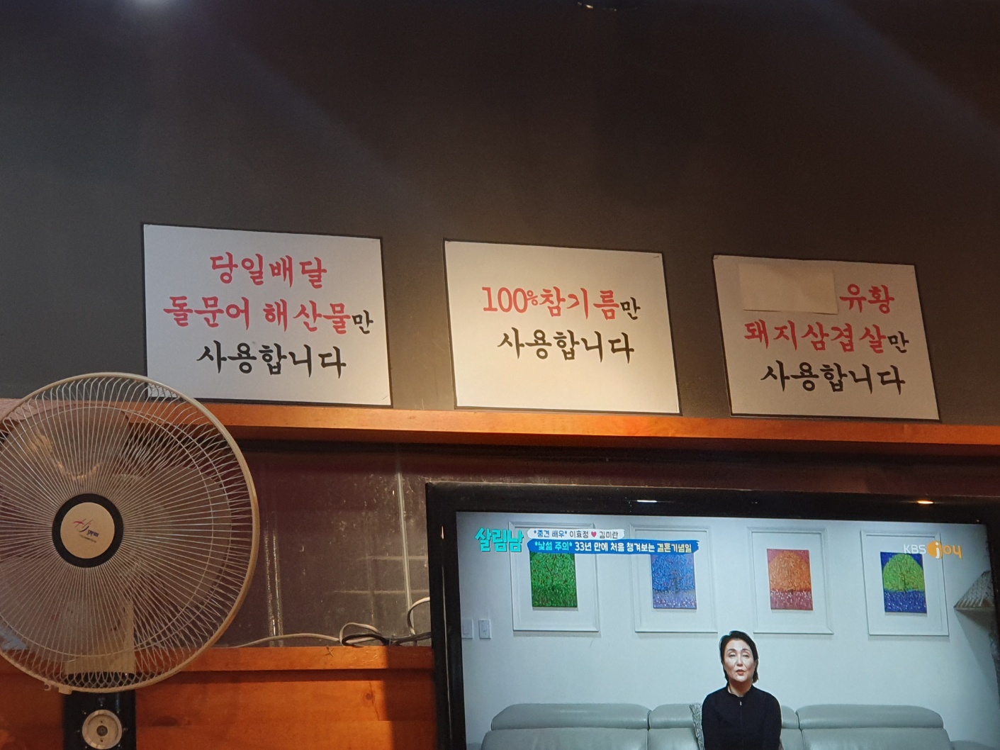 벽면에는 각종 메뉴들을 선전하는 종이들이 붙여져 있고 그 사이에 조개찜을 먹는 방법과 사장님의 말씀도 붙여져 있습니다.