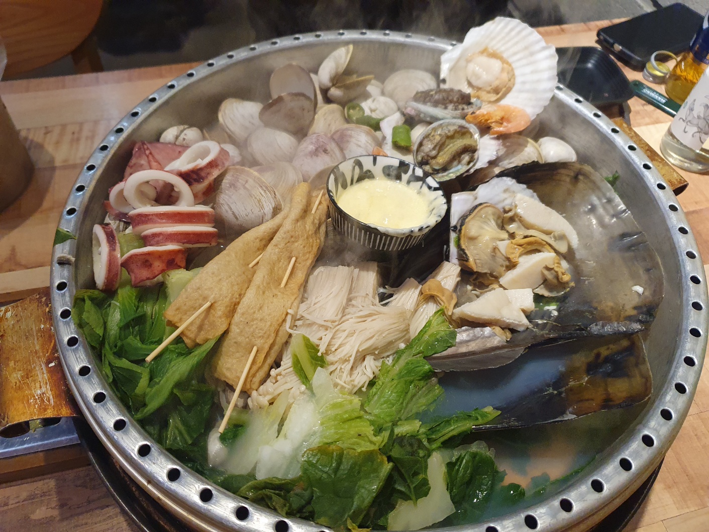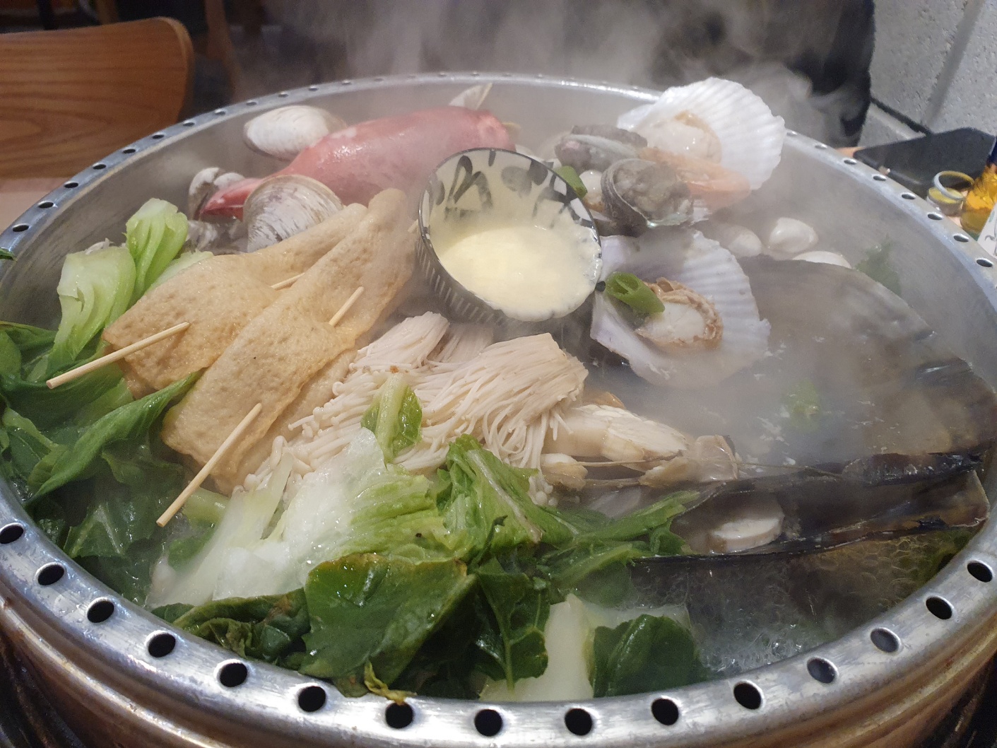 뚜껑이 열리니 통통한 오징어부터 전복, 가리비, 키조개, 어묵, 각종 야채들이 수북이 쌓여 있는 모습입니다.