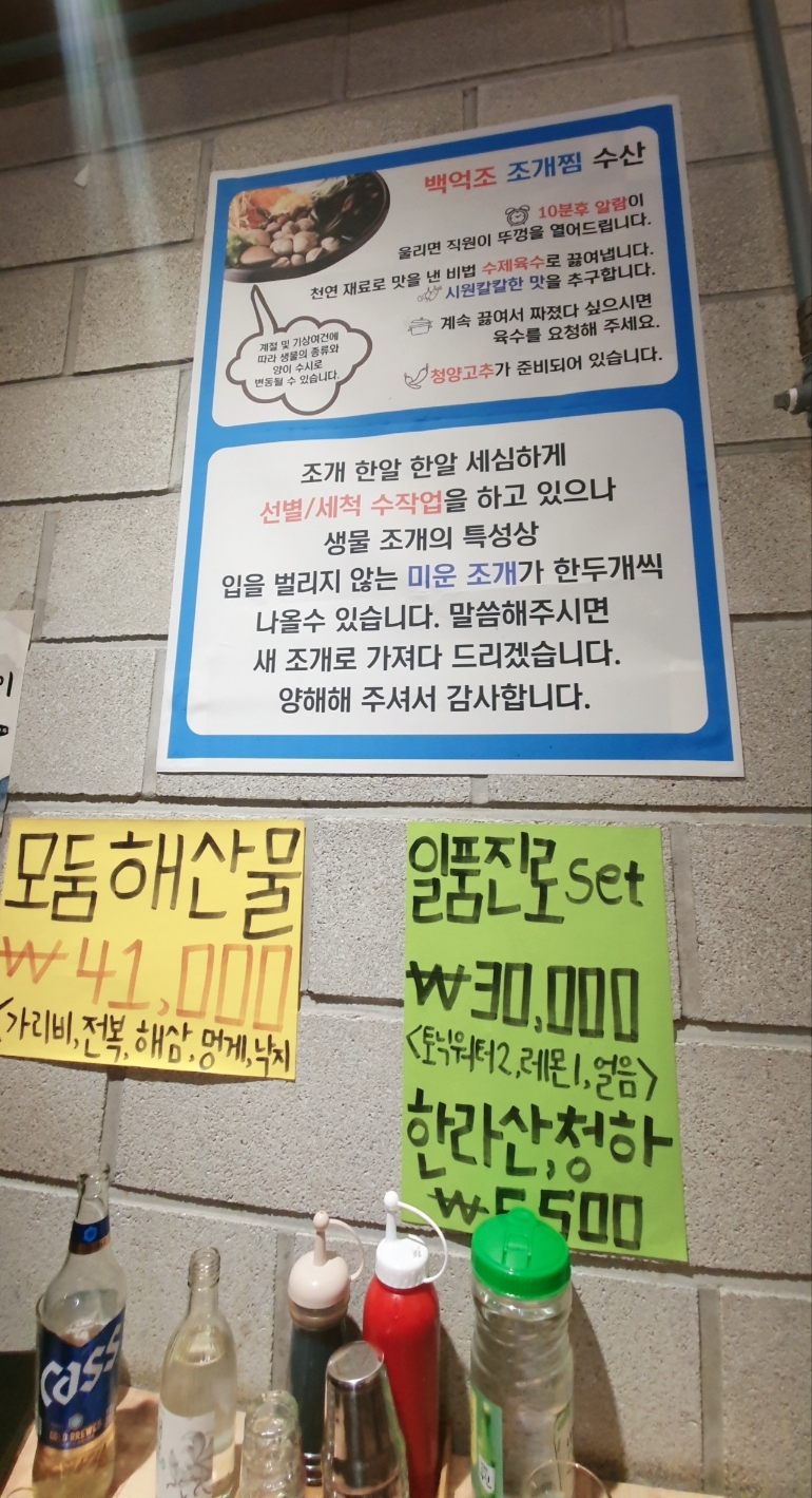 벽면에는 각종 메뉴들을 선전하는 종이들이 붙여져 있고 그 사이에 조개찜을 먹는 방법과 사장님의 말씀도 붙여져 있습니다.