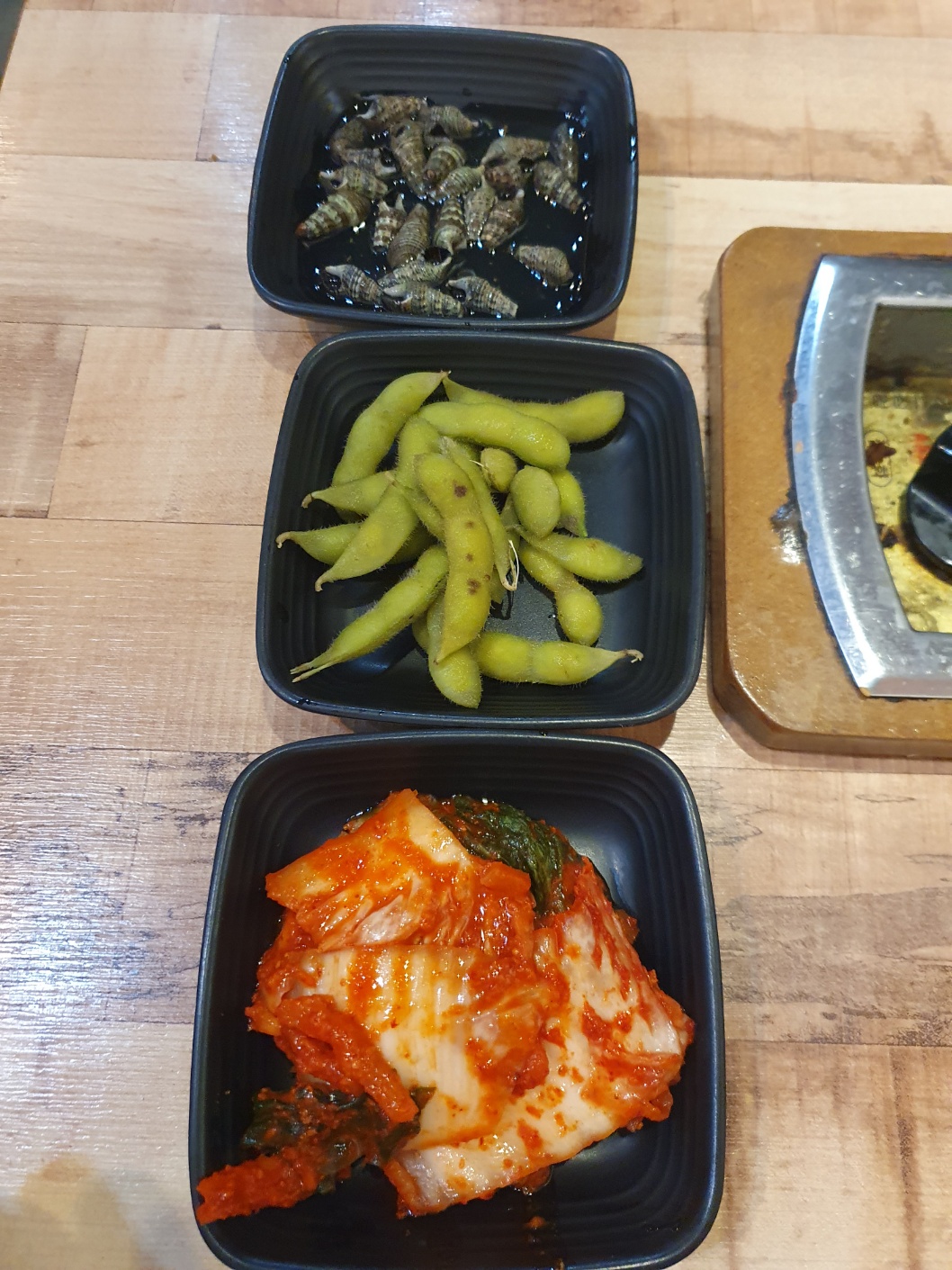 뚜껑이 닫힌 상태에서 타이머 10분이 지나면 열어주시겠다고 말씀해 주셨는데 기본찬으로 나온 소라도 먹고 콩도 까먹고 기다리는 시간이 지루하지 않았답니다. 그리고 여기 김치!! 정말 맛있답니다. 매운 김치 맛이 정말 좋았어요.