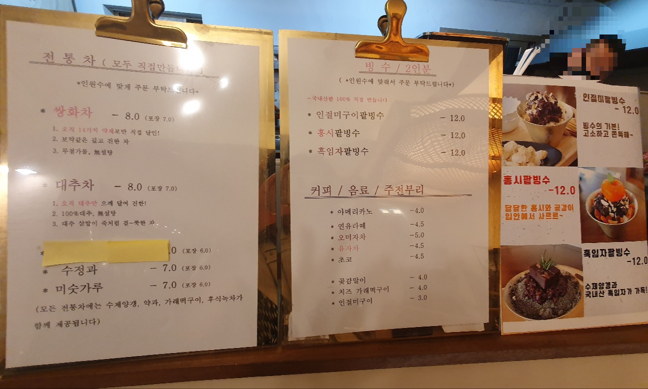메뉴: 전통차(대추차, 쌍화탕), 밭빙수, 홍시빙수, 인절미 구이 등