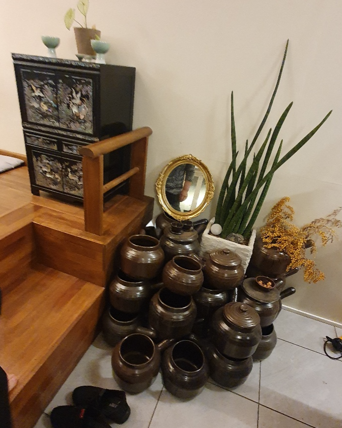 이곳저곳에는 현대적인 느낌과 전통적인 느낌이 공존하는 독특한 인테리어로 꾸며져 있습니다. 항아리와 고급스러움을 풍기는 자개공예품들이 자리를 잡고 있는데, 테이블 색상과 잘 어울려 전통찻집 분위기를 물씬 풍겨줍니다.