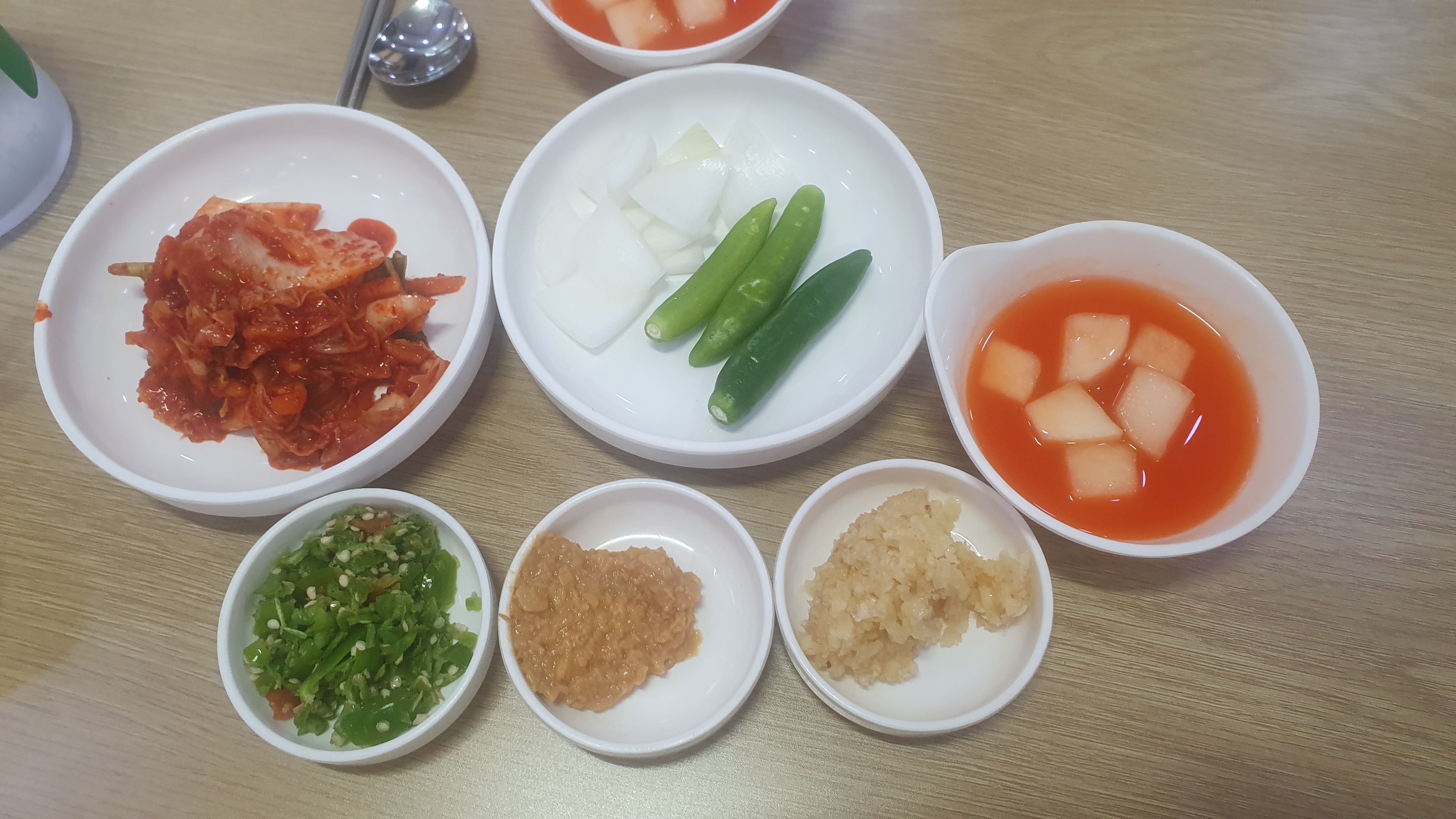 배추김치, 양파와 고추, 다진 고추와 쌈자과 마늘 그리고 떠먹을 수 있는 새콤달콤 무김치가 기본 찬으로 나옵니다.