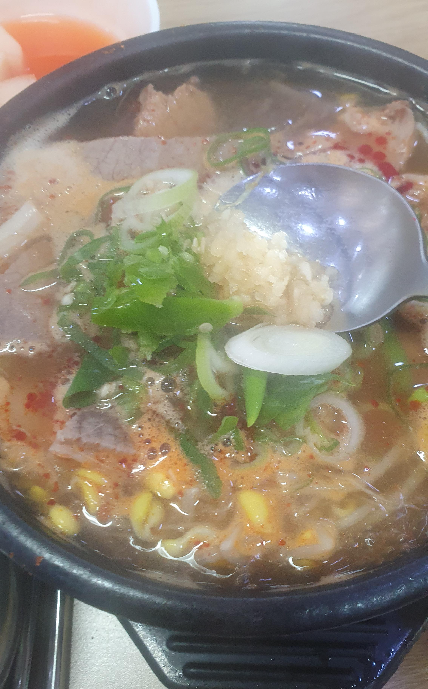 뜨거운 뚝배기에 먹음직스러운 해장국이 담겨 나왔습니다. 국물도 넘치기 전까지 가득 담겨 있어 해장을 원하시는 분들에게 너무 필요한 음식이지 않을까 싶습니다.