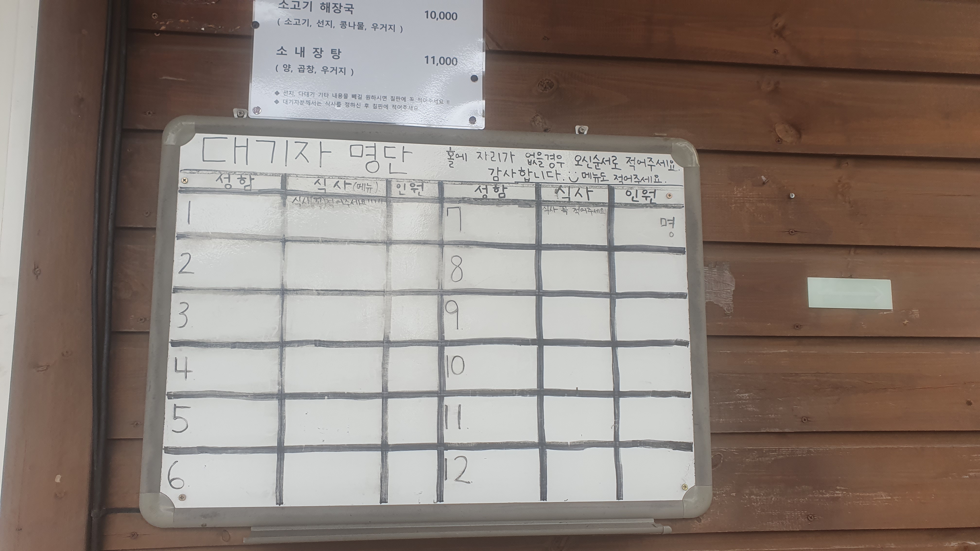 손님이 꽉 찼을 때는 대기자명단에 성함, 식사, 인원을 적어주시면 되는데 12번까지 다 차있으면 직원분께서 앞쪽에 드시고 나가신 명단을 삭제해 주시니 1번으로 기입하시면 됩니다. 입구 오른편에 대기하는 공간도 있습니다. 회전율이 빠르니 기다리시는 것을 추천!