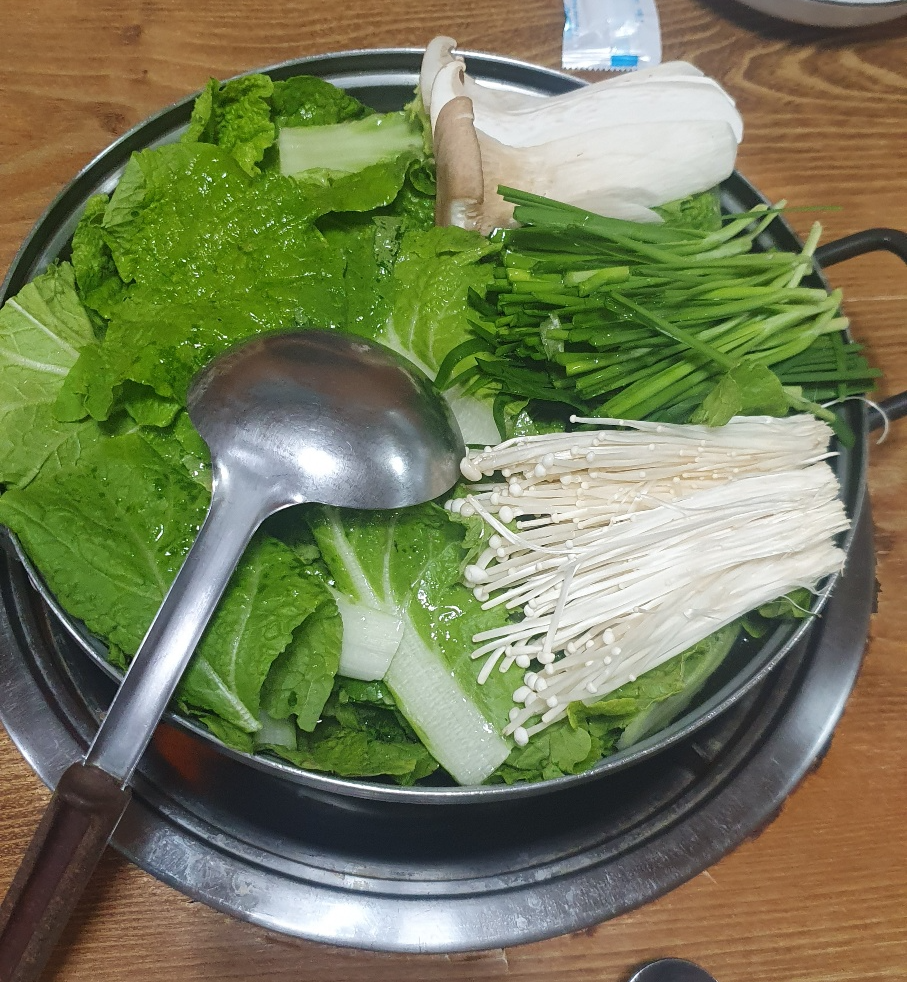 주문을 하면 곧바로 가스버너에 불을 켜주십니다. 그 위로 배추, 부추, 버섯이 가득 담겨 있는 냄비가 올려집니다.
