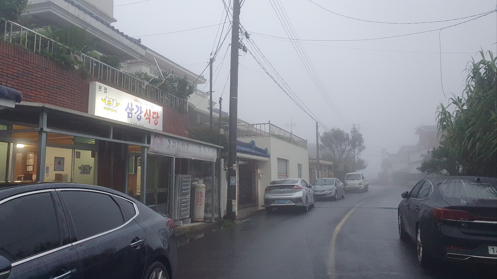 삼강식당은 서귀포 서호동에 위치해 있고, 신서귀포의 가장 위쪽에 자리 잡고 있어 장마철에는 이렇게 안개가 잘 낀답니다. 식당 주차장은 따로 없으며 가게 맞은편에 공영주차장이 있지만 길에도 주차를 많이 하십니다. 가게는 겉으로 보면 오래된 집처럼 보이지만 그만큼 전통 있고 맛있는 가게입니다!