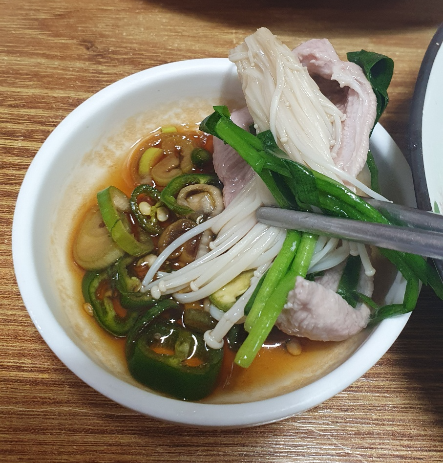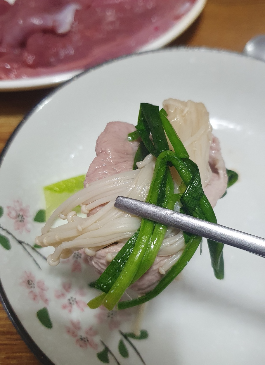육수가 끓으며 채소가 숨이 죽으면 고기를 한점 한점 넣어 익힙니다. 고기가 두툼해서 바로 익지 않지만 원하는 익힘 정도를 맞춰 샤브를 즐기시면 됩니다.
