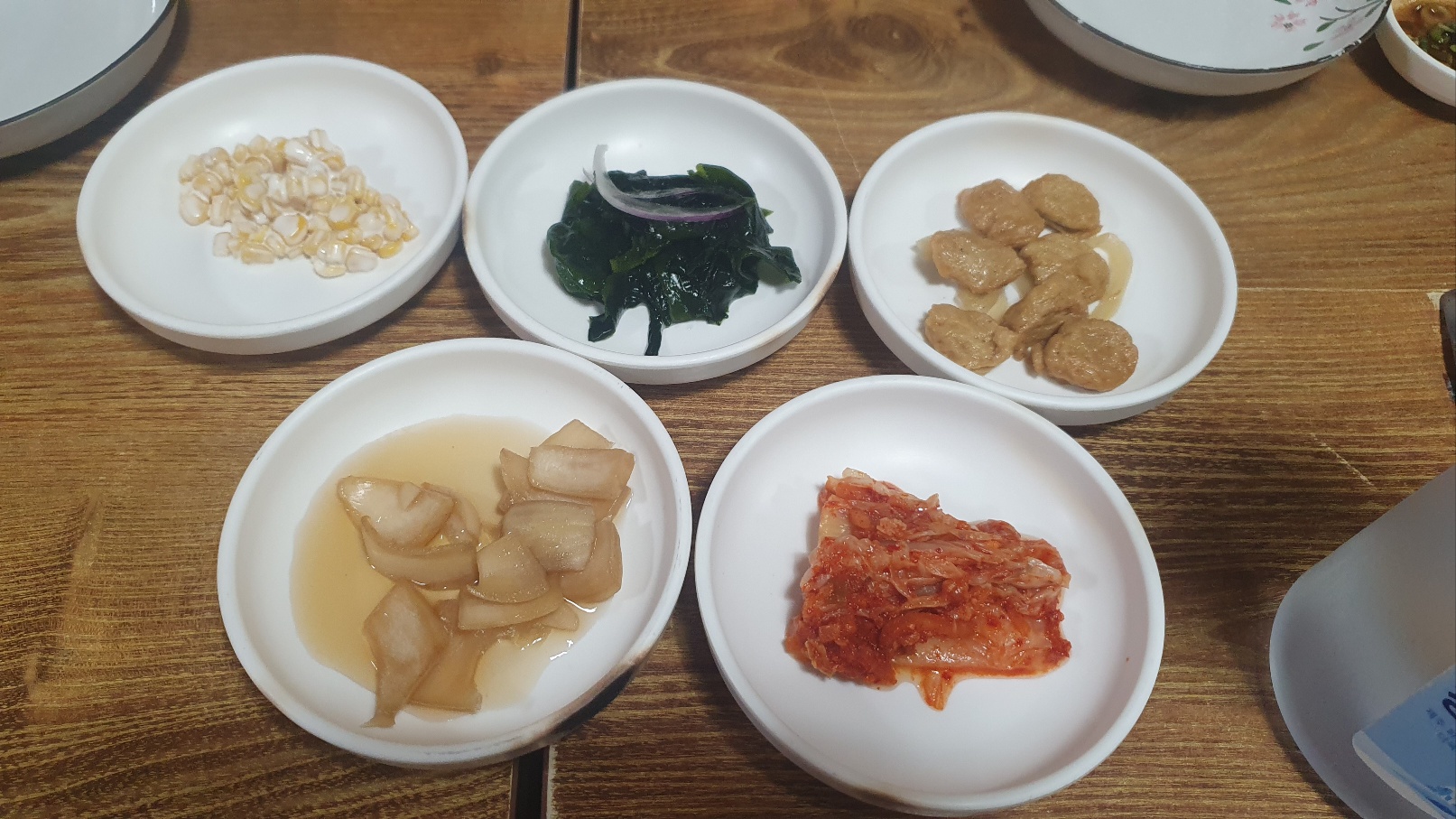 기본 찬으로는 배추김치, 양파절임, 미역무침, 어묵볶음, 콘샐러드가 나옵니다. 예약을 해서 이미 테이블 위에 놓여 있었답니다.