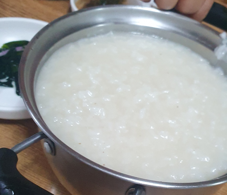 오리 죽은 따로 냄비에 나옵니다 색깔이 조금 하얀 것 같지만 그 맛은 엄청 구수하고 부드럽습니다. 저는 조배기보다 오리죽에 한 표를 던집니다.
