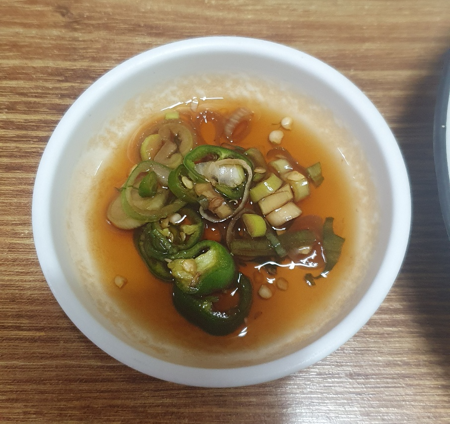 꼭 이야기하고 넘어가야 할 양념장이 있습니다. 바로 파와 고추가 들어간 간장소스랍니다. 직접 개발한 특제 간장소스로 오리 샤브를 먹을 때 이 소스를 찍어 드시면 엄청나게 맛있어서 리필은 필수입니다.