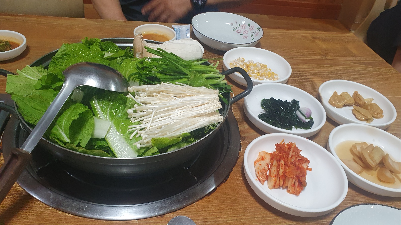 주문을 하면 곧바로 가스버너에 불을 켜주십니다. 그 위로 배추, 부추, 버섯이 가득 담겨 있는 냄비가 올려집니다.