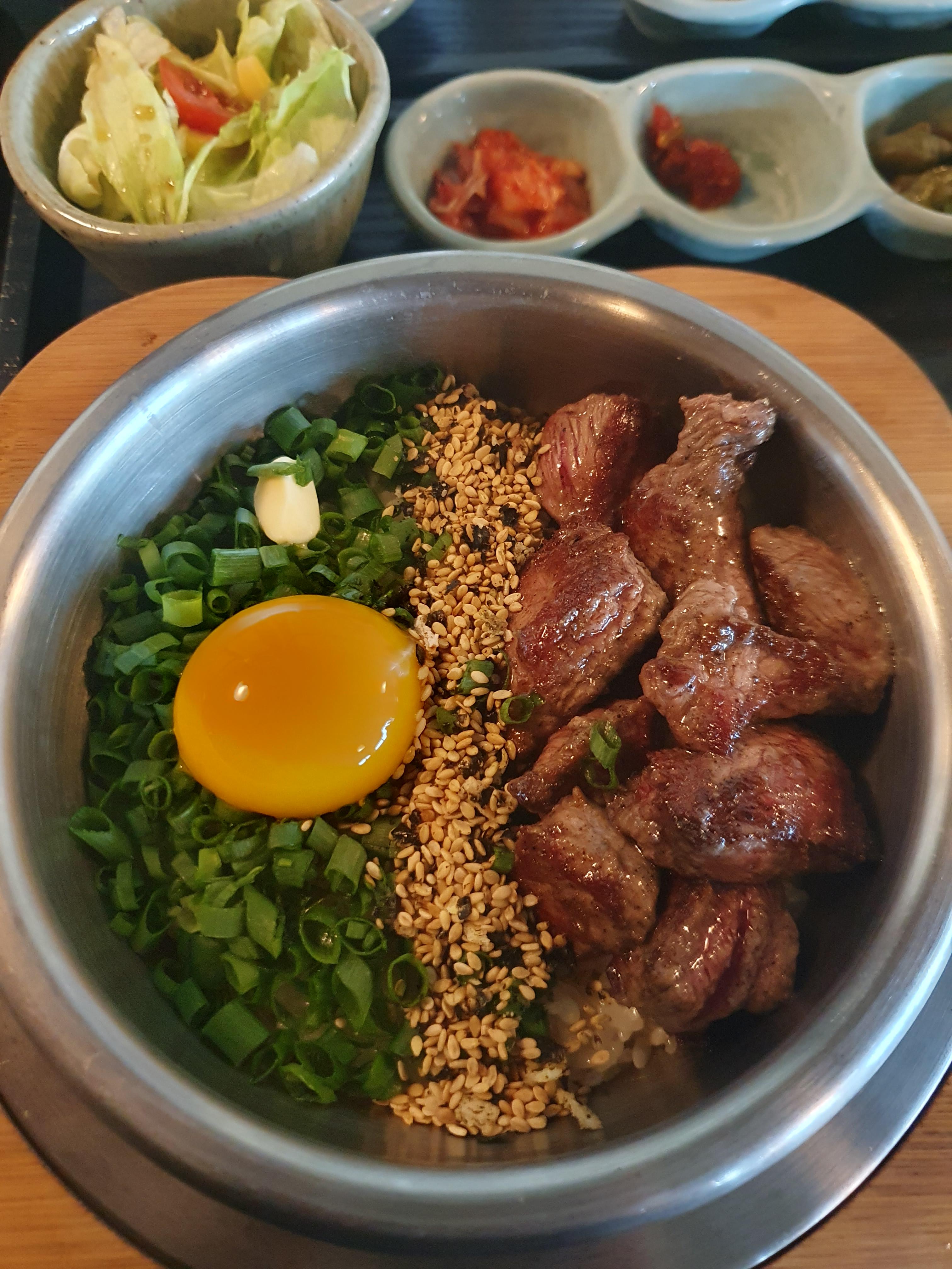 프리미엄 소고기 중 가장 질 좋고 육향이 좋은 부위를 고온에 짧은 시간조리해 고급소고기의 매력을 그대로 담은 녹진한 솥밥입니다. 이곳 사장님의 따님이 가장 추천하는 음식이라고 하네요!