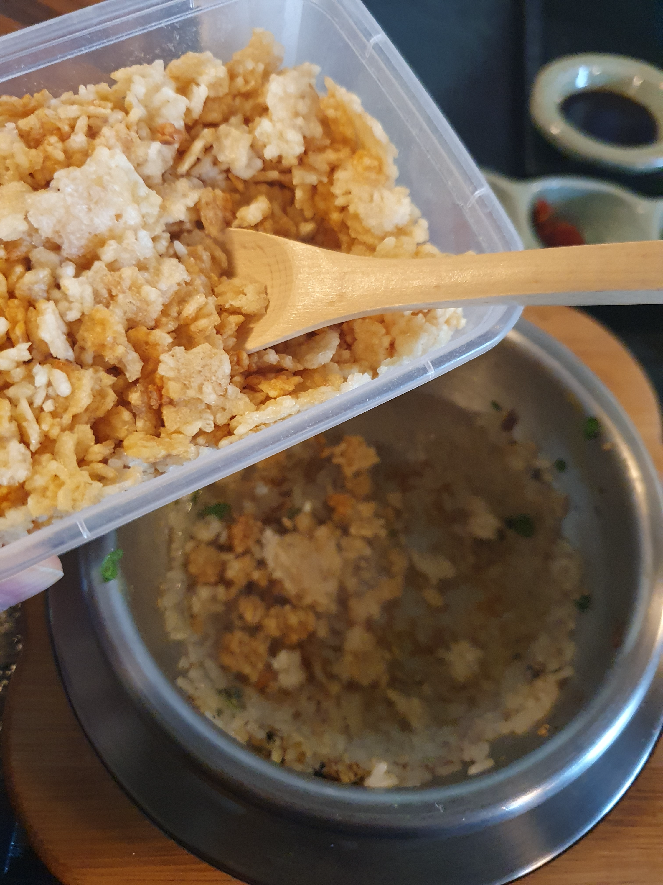 2. 누룽지와 육수를 부어 뚜껑을 닫고 식사를 합니다. 후에 뚜껑을 열어 누룽지를 먹습니다.
