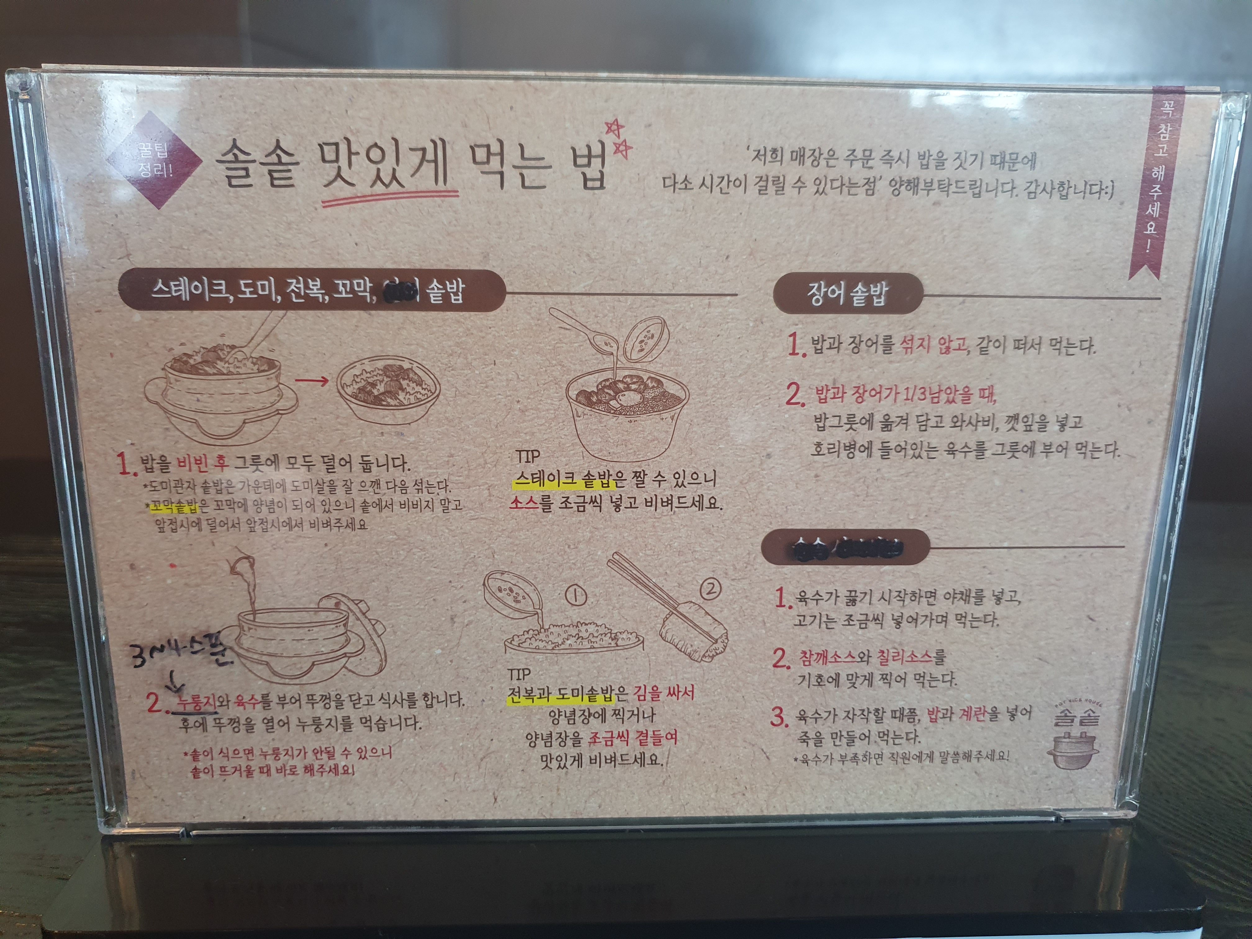 테이블 위에는 누룽지가 담긴 용기와 숟가락이 놓여 있는데요, 솔솥을 맛있게 먹는 법이 자세하게 나와 있으니 그대로 따라 해 보겠습니다.