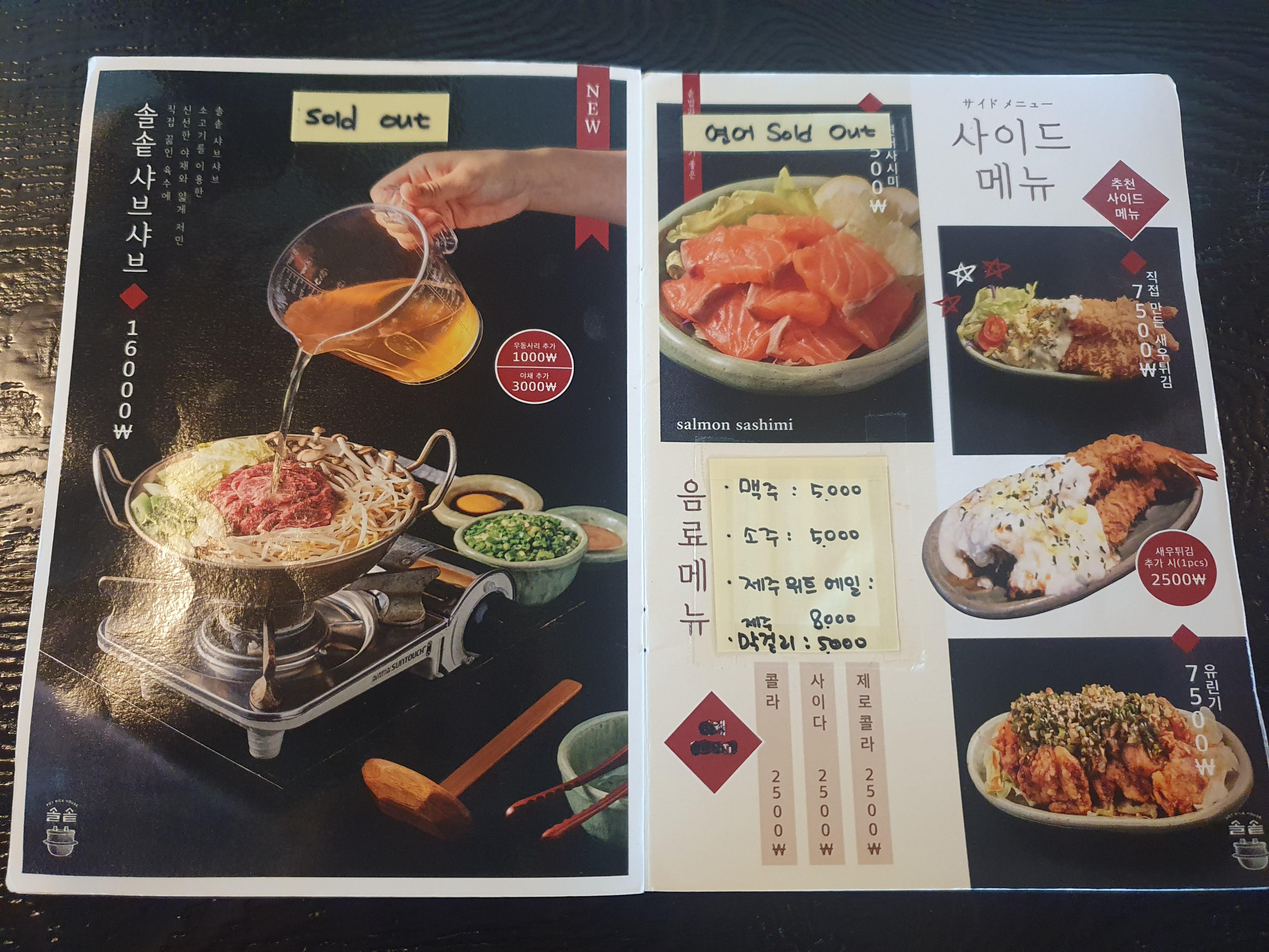 사이드 메뉴로는 직접 만든 새우튀김과 유린기가 있습니다. 솔솥 샤부샤부와 연어사시미도 있지만 sold out이네요.