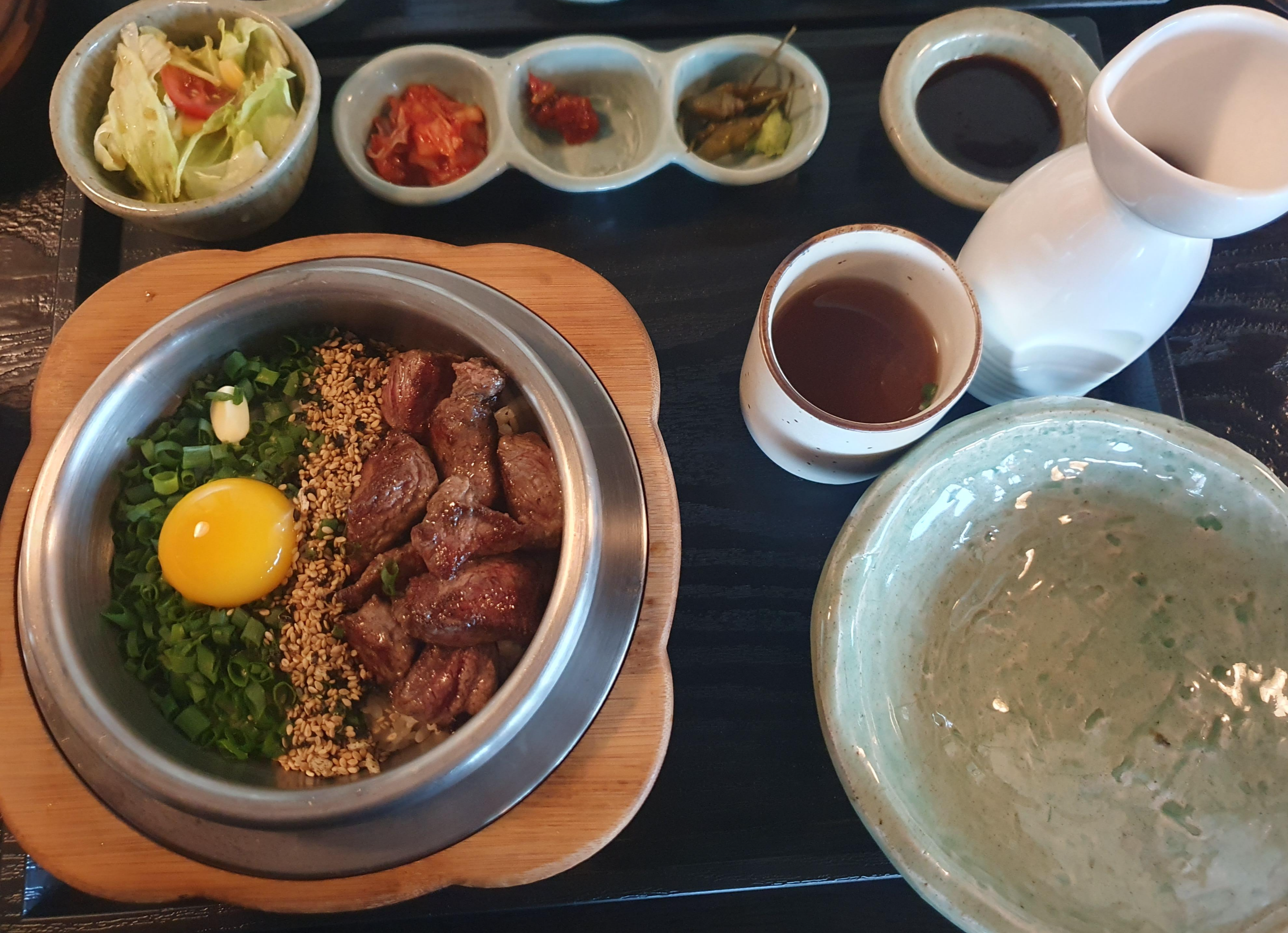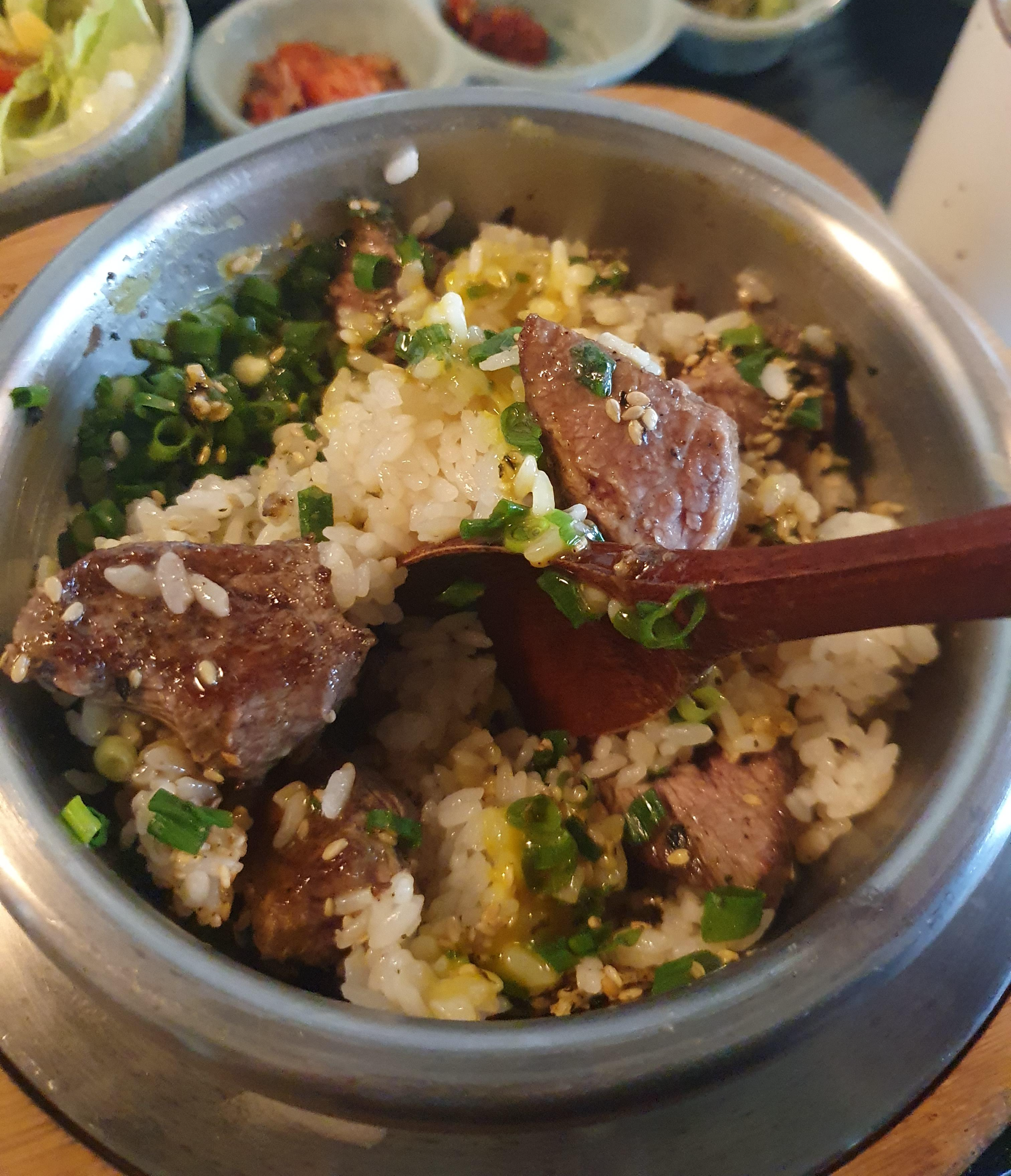프리미엄 소고기 중 가장 질 좋고 육향이 좋은 부위를 고온에 짧은 시간조리해 고급소고기의 매력을 그대로 담은 녹진한 솥밥입니다. 이곳 사장님의 따님이 가장 추천하는 음식이라고 하네요!