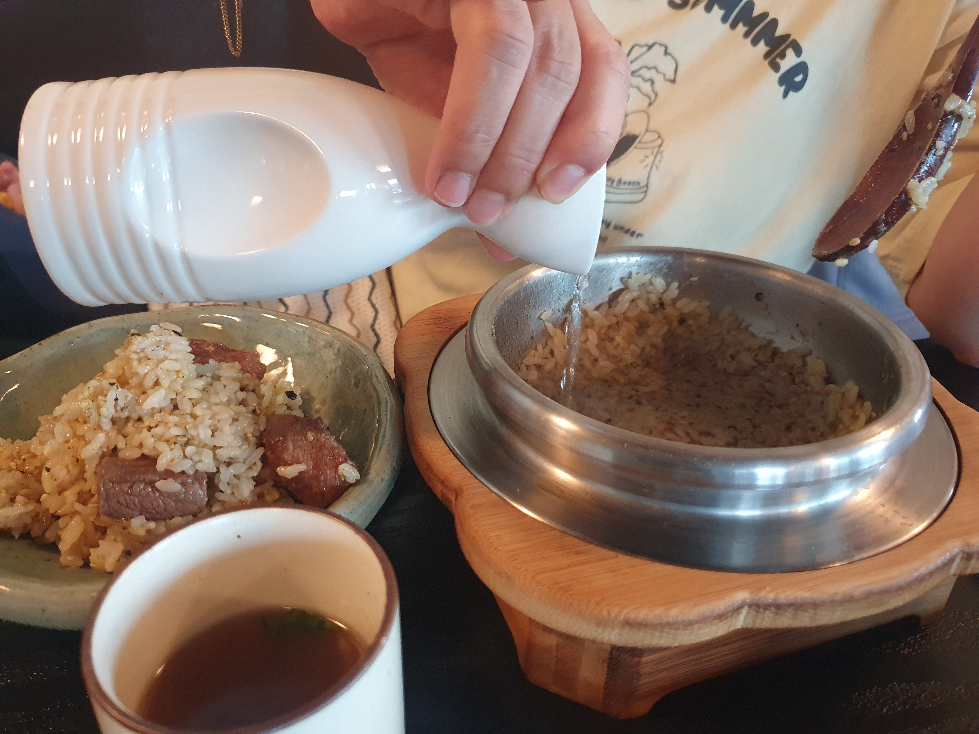 2. 누룽지와 육수를 부어 뚜껑을 닫고 식사를 합니다. 후에 뚜껑을 열어 누룽지를 먹습니다.