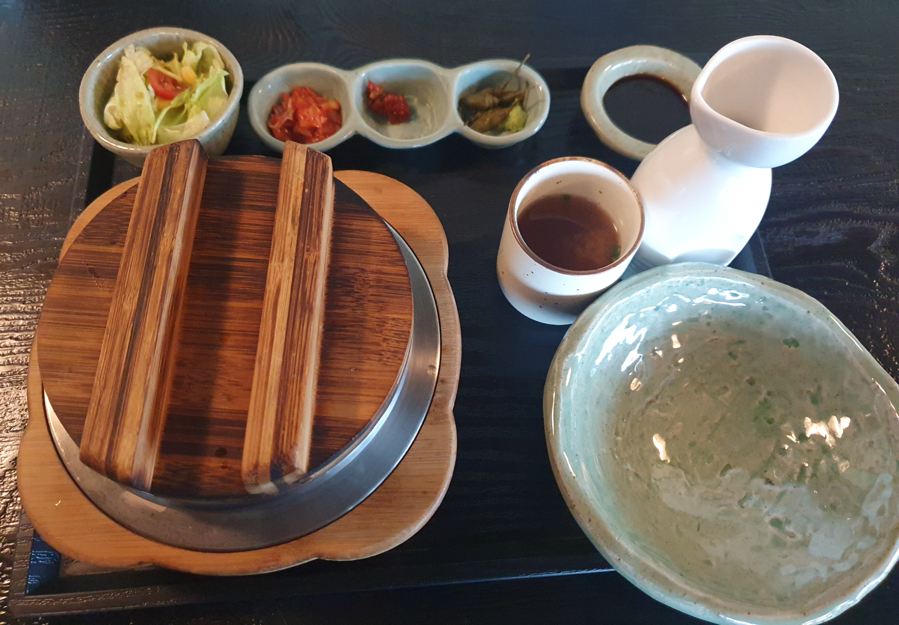 음식은 그리 오래 걸리지 않았답니다. 솥밥과 빈 그릇이 나란히 놓여 있고 샐러드, 김치, 오징어젓갈, 고추절임이 반찬으로 나왔습니다.