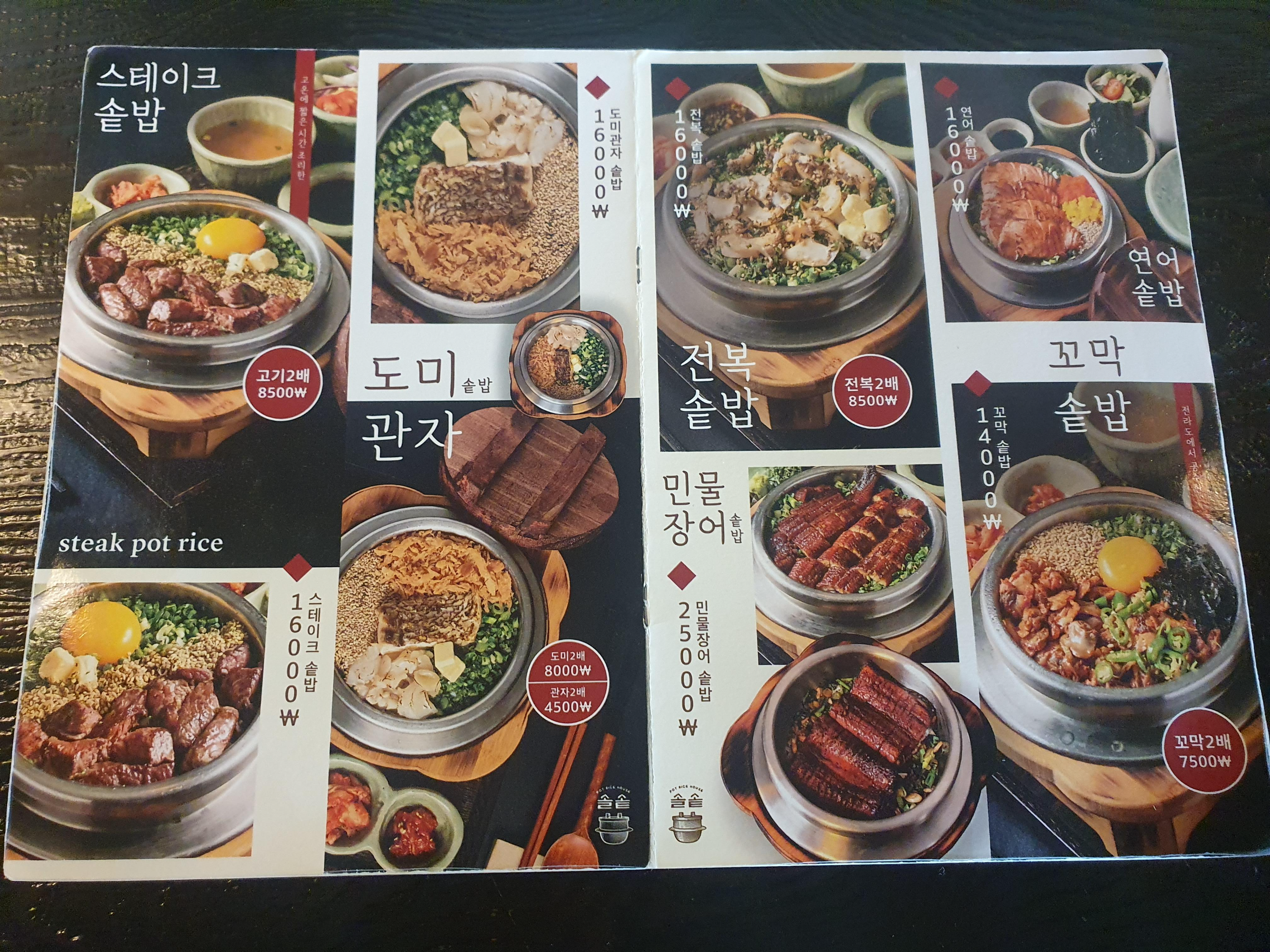 다양하고 먹음직스러운 재료들이 들어있는 솔솥 메뉴판입니다.