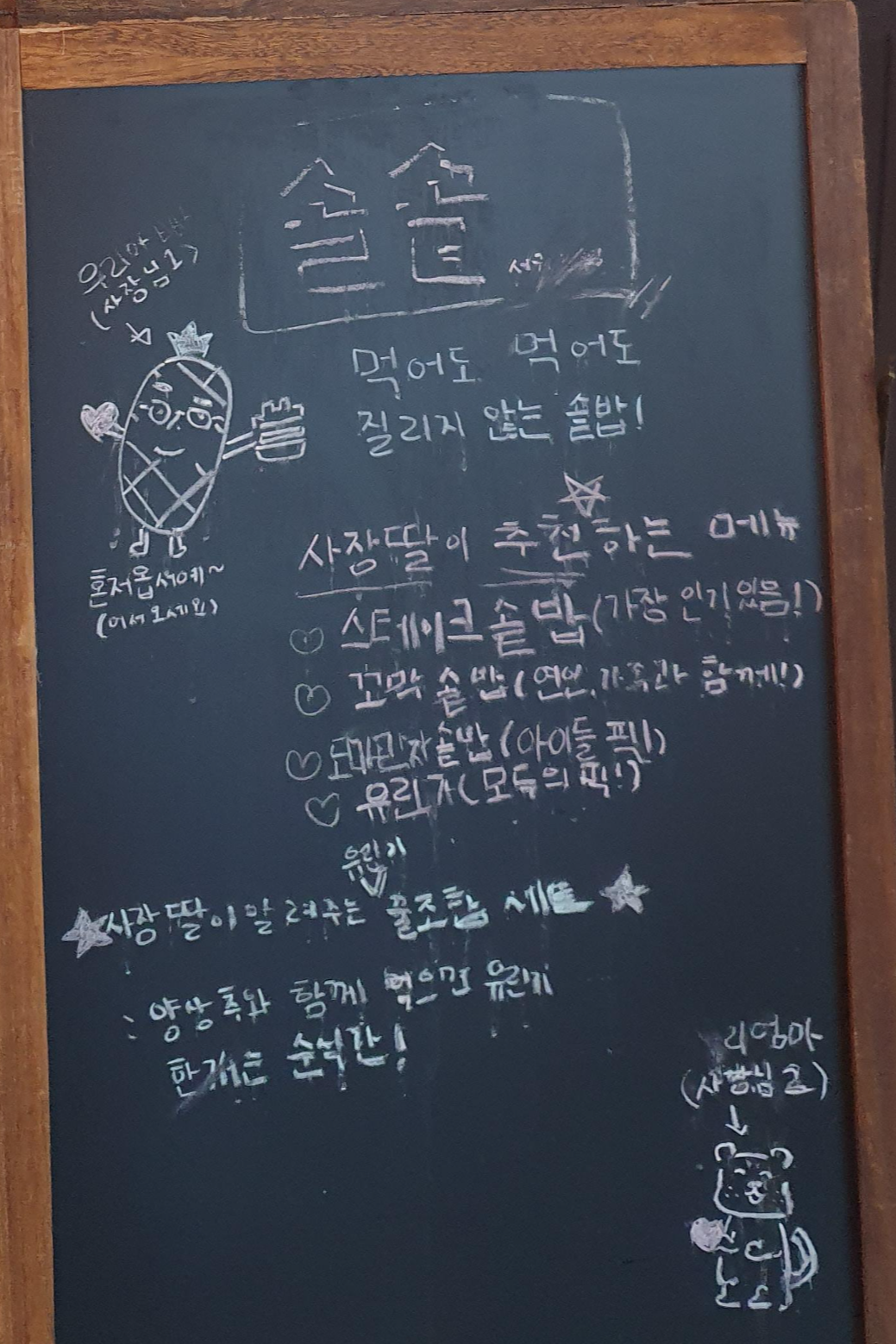 칠판을 보시면 사장님 따님이 추천하는 메뉴로 꼽힌 첫뻔째가 스테이크 솥밥입니다.