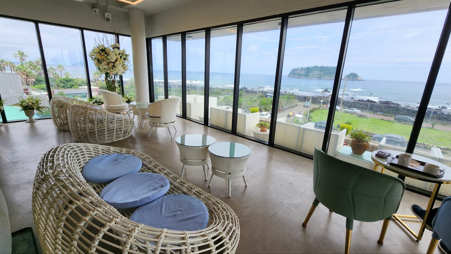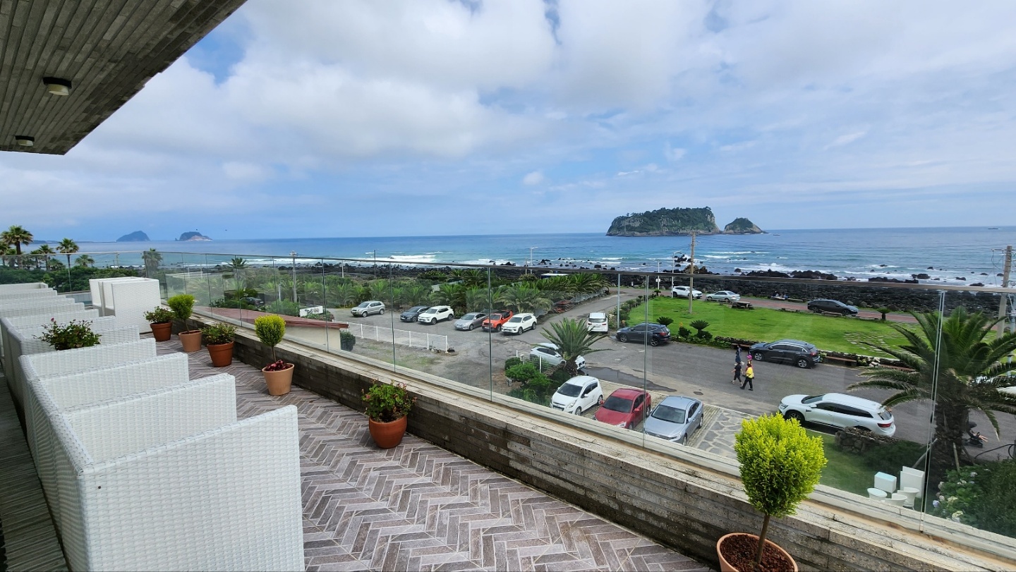 바다 가장 가까이에는 범섬이 자리 잡고 있고 왼쪽 편으로는 섶섬과 문섬까지 보이고 오른편으로는 강정 해군기지가 있는 강정포구까지 보실 수 있으니 문을 열고 야외 테라스로 나가 탁 트인 제주바다를 느껴보시기 바랍니다.