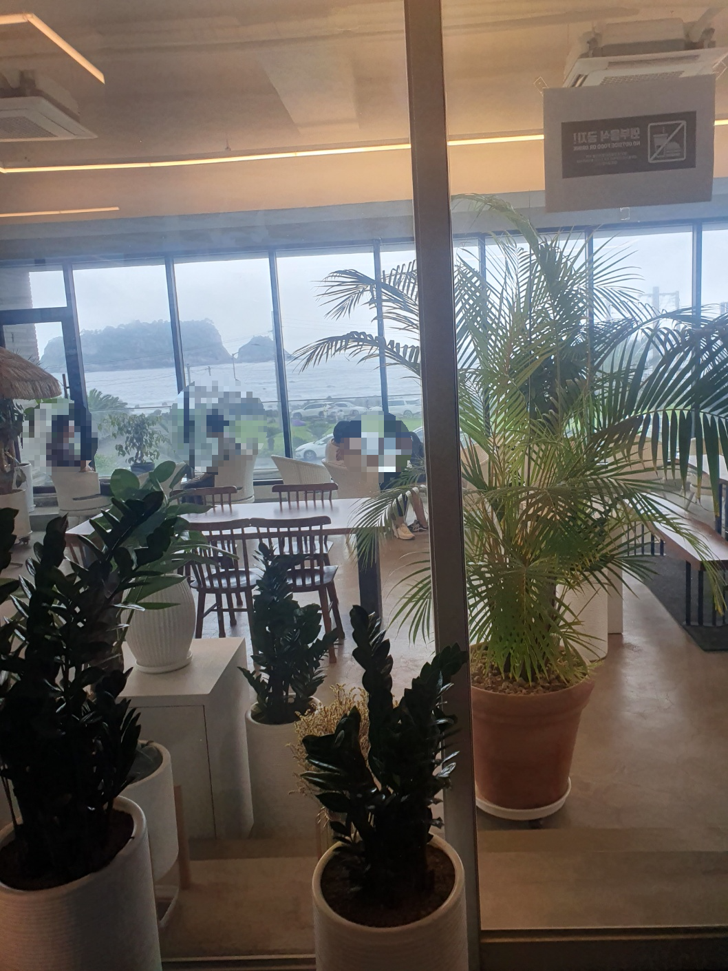 3층으로 올라가면 넓은 통유리 밖으로 바다 풍경이 펼쳐져 있는 것을 보실 수 있습니다. 2층 바다뷰도 좋지만 저는 3층에 자리를 잡으시길 추천드립니다. 흐리다가 햇볕이나기 시작해서인지 사진이 너무 잘 나오네요. 친구들과 사진을 찍어도 인생샷이 나올법한 인테리어와 야외 전경입니다.