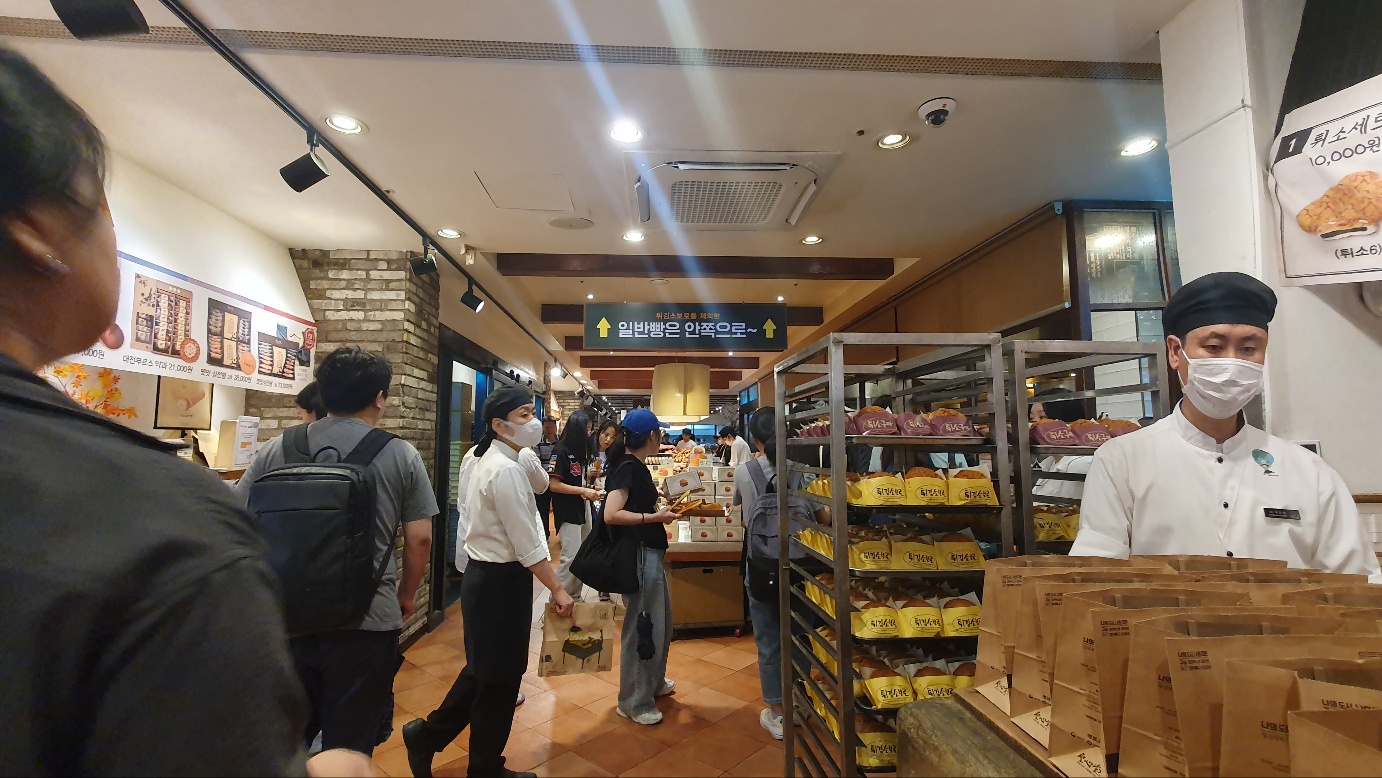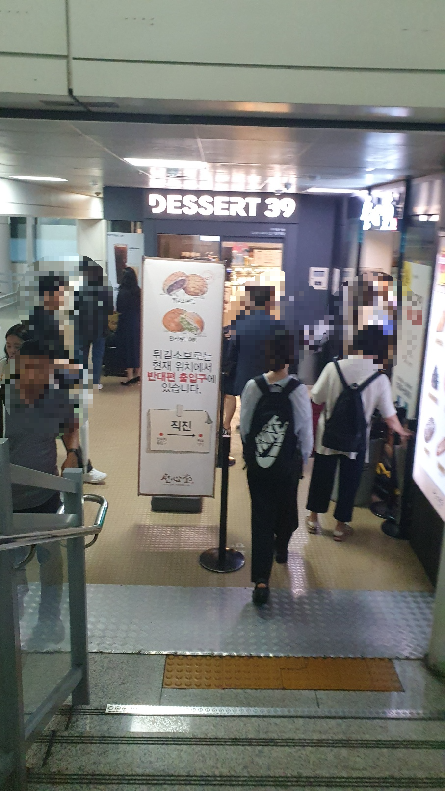 이렇게 계단을 내려가면 오른쪽로 성심당이 있습니다. 입구로 입장하시면 일반 빵을 구매하실 수 있고 튀김소보로를 구매하시려면 입장 후 직진하셔서 반대편 출입구 쪽으로 나가서 따로 구매가 가능합니다. 생각보다 줄이 많지 않아 5분 정도 기다리고 바로 구매할 수 있었습니다. 본점에 갔다면 얼마나 오래 기다렸을지 생각만 해도 지친데 금방 구매 가능해서 좋았습니다.