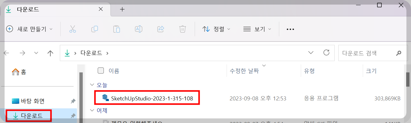 다운로드 폴더로 들어가시면 오늘 날짜로 받은 스케치업 프로그램을 확인하실 수 있습니다.