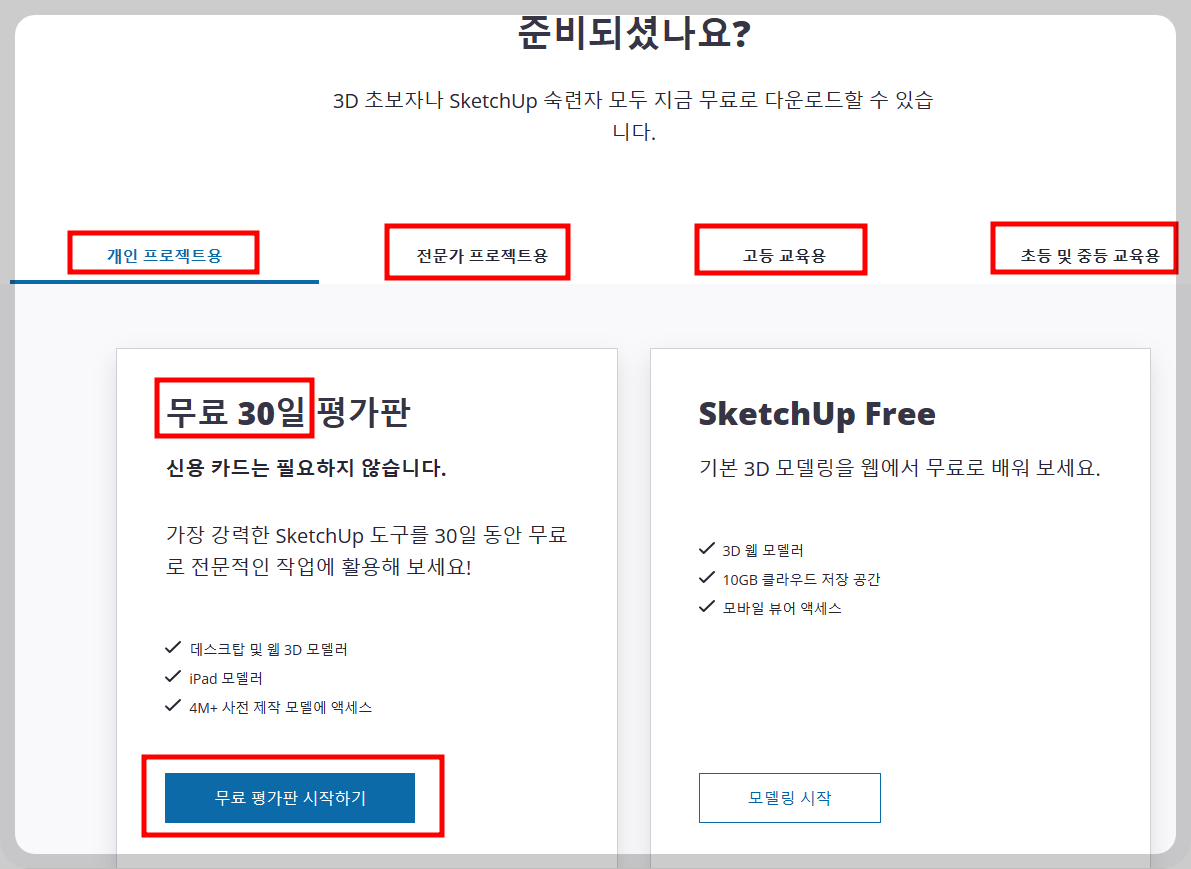 그래서 스케치업 체험판이 준비되어 있답니다.