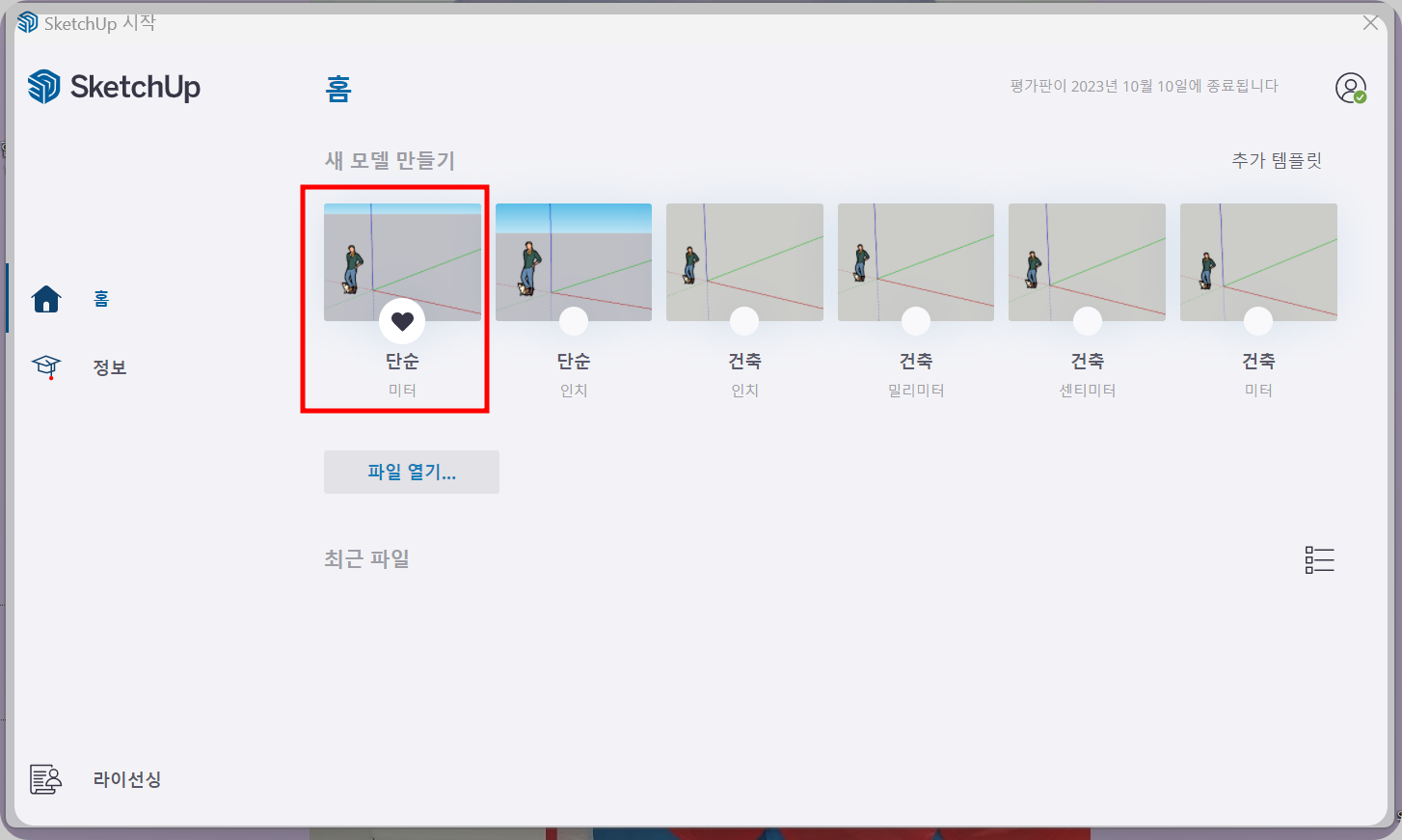스케치업이 열리면 나오는홈화면입니다.