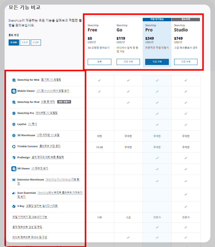 스케치업이 제공하는 모든 기능을 살펴보고 적합한 플랜을 찾아보세요.