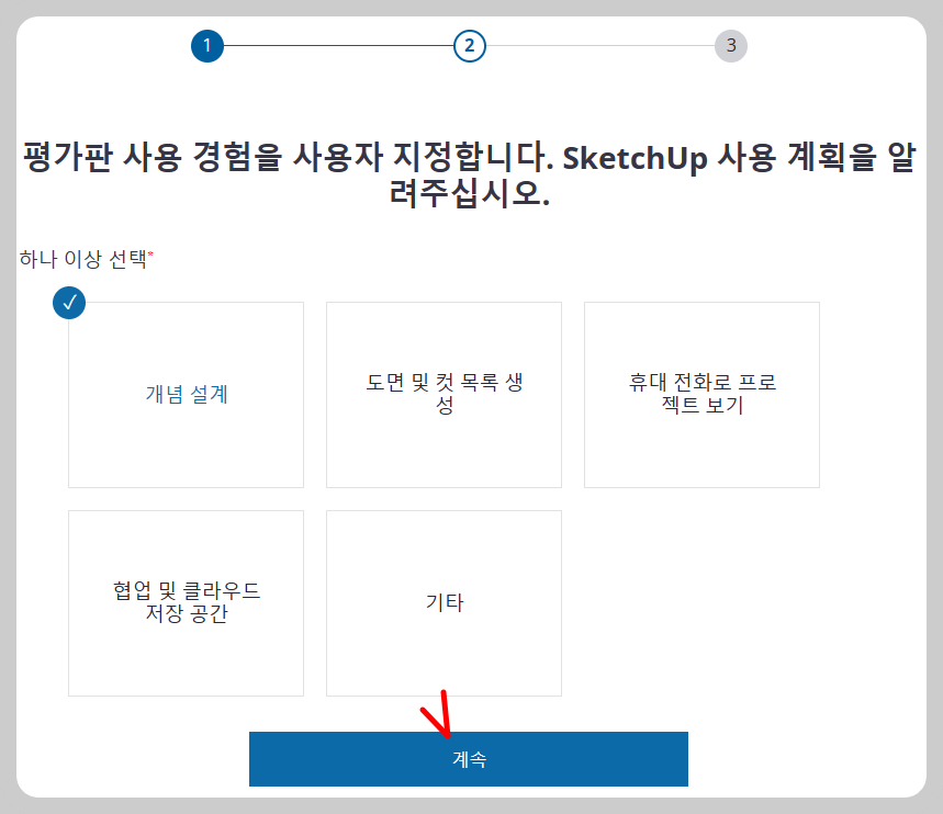 두 번째 단계로 평가판 사용 경험을 지정해 주어야 하는데요, 1개 이상 선택을 하면 되기에 가장 첫 번째 개념 설계 1개를 클릭하고 진행했습니다.