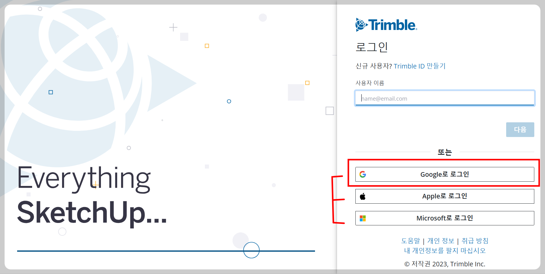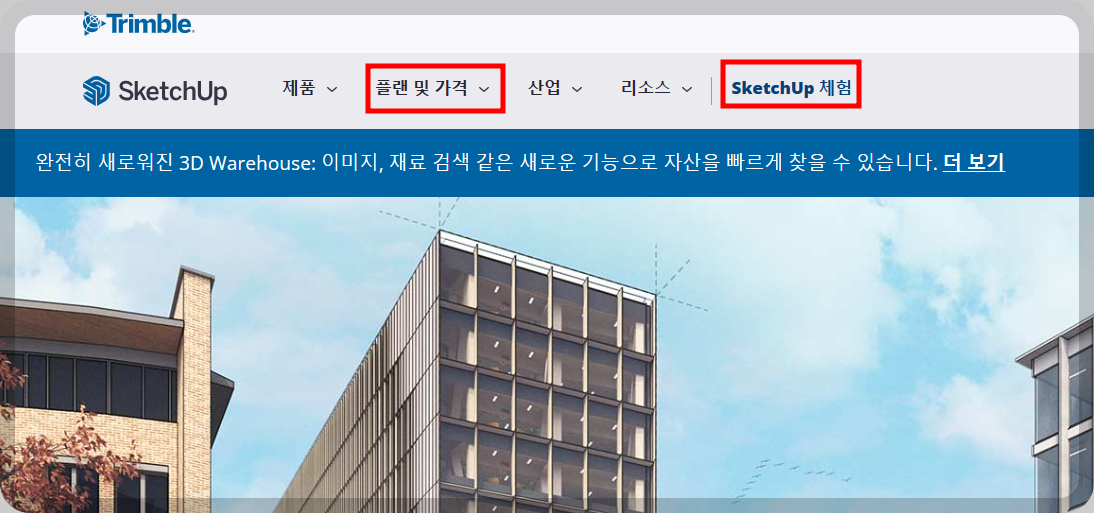 구글 스케치업으로 알고 계신 분들도 계실 텐데 지금은 트램블사로 넘어와 홈페이지를 보시면 상단에 트램블이라 적혀 있는 것을 보실 수 있습니다.