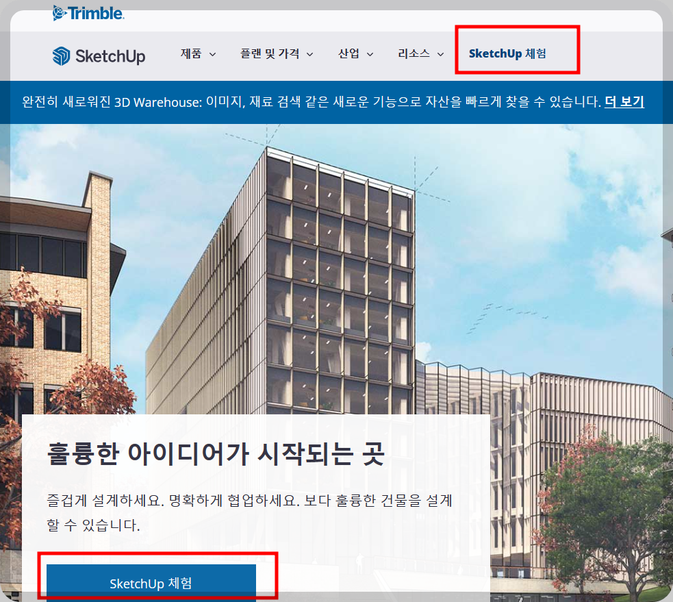 홈페이지 상단의 스케치업 체험 버튼을 클릭하시거나 아래쪽에 나온 파란색 체험버튼을 클릭하셔도 됩니다.