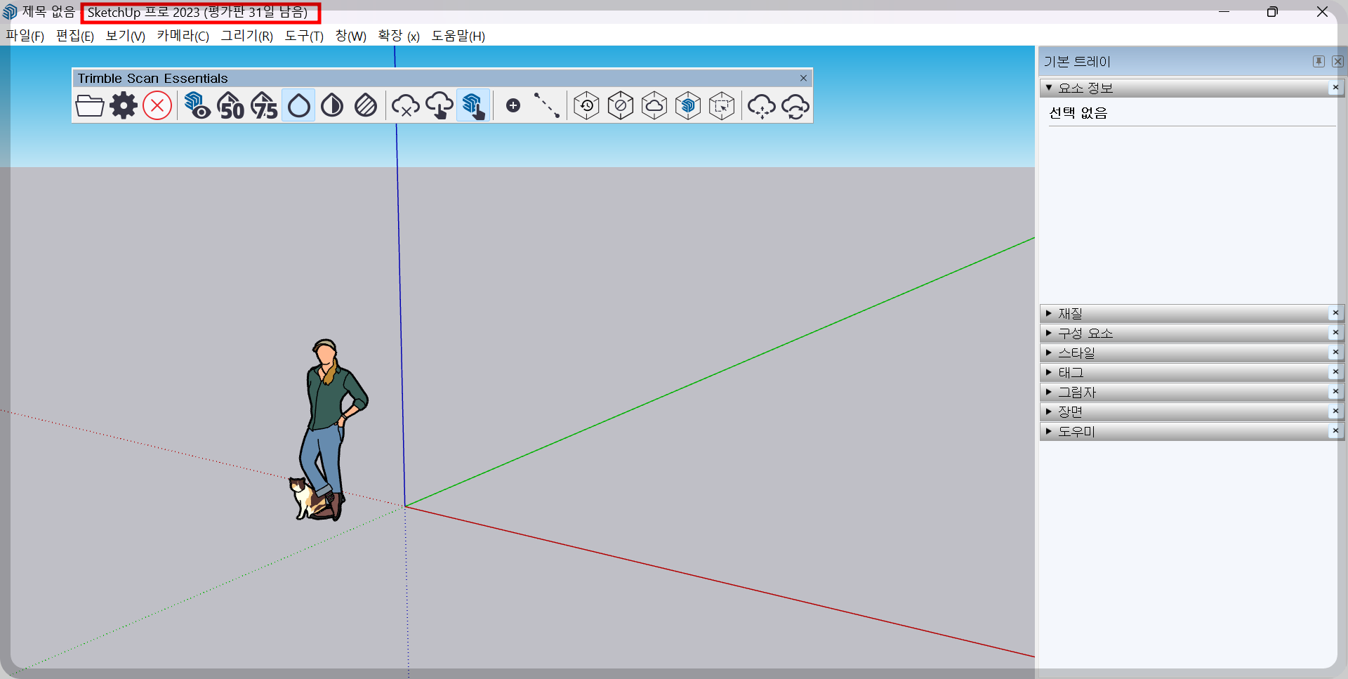 스케치업 2023 버전의 사람옆에는 귀여운 고양이가 한 마리 추가되어 있습니다.
