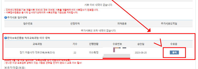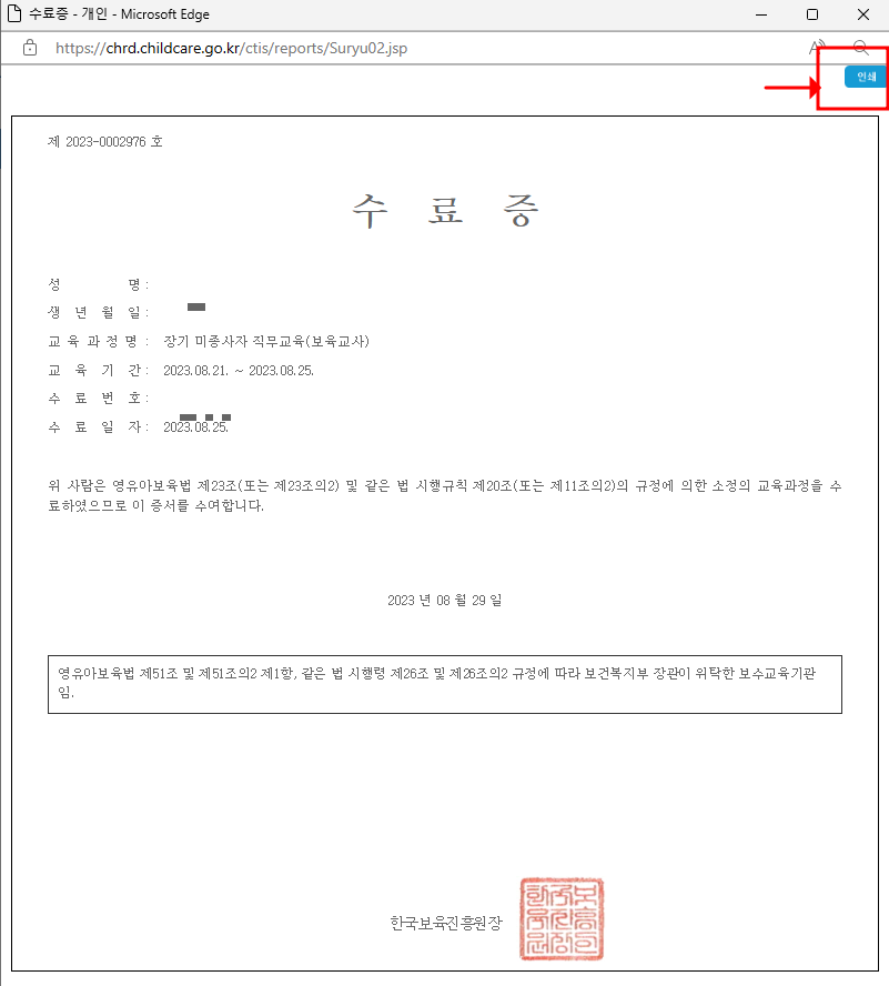 한국보육진흥원 직무교육과정 이수내역 [출력] 클릭하기