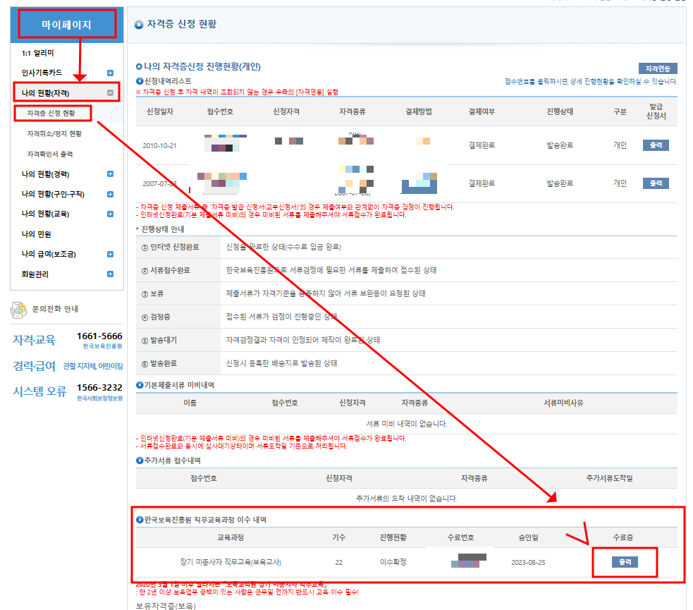 마이페이지→나의 현황(자격)→자격증 신청 현황