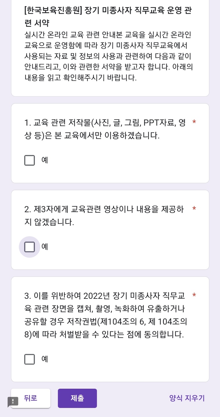 무교육 운영 관련 서약까지 동의한 후 제출을 완료해야만 합니다.