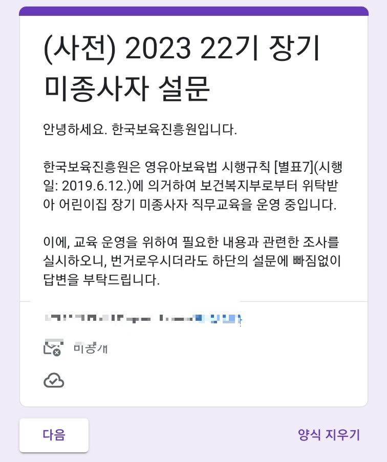 #어린이집 장기미종사자 직무교육 교육 온라인 신청을 하고 3일째가 되는 오늘 2023. 07. 31일에 문자가 도착했습니다.