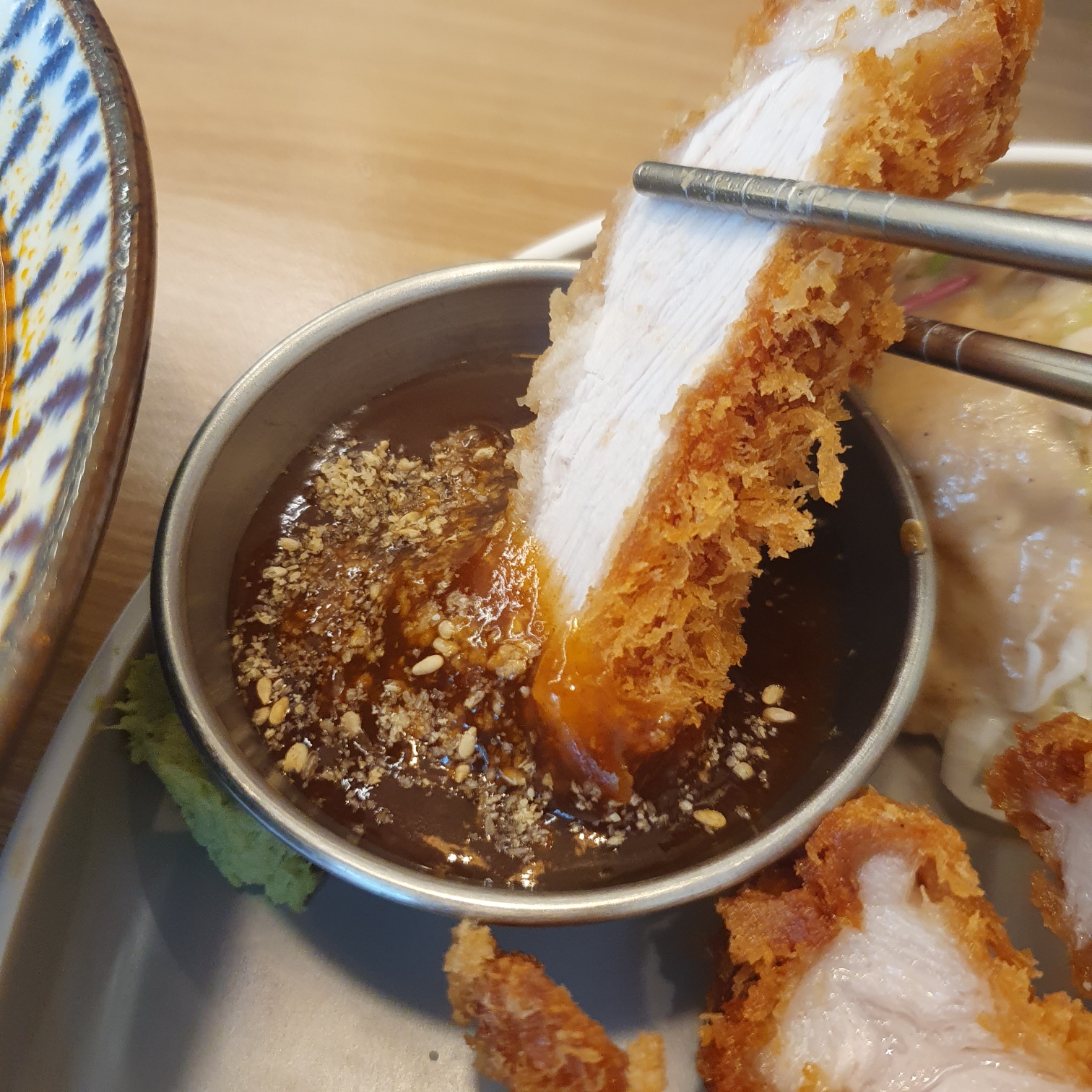 돈가스 테두리와 끝부분에 지방이 도톰하게 자리 잡고 있고 크기도 상당합니다. 갈아놓은 통참깨를 소스에 넣어 함께 먹으니 정말 맛있습니다.