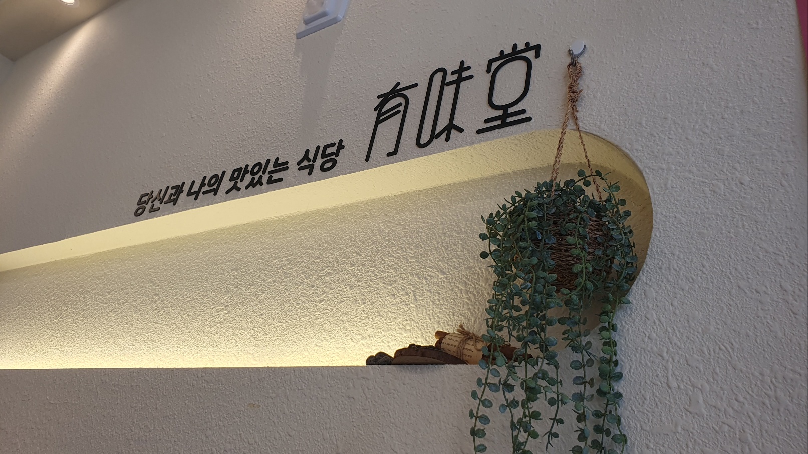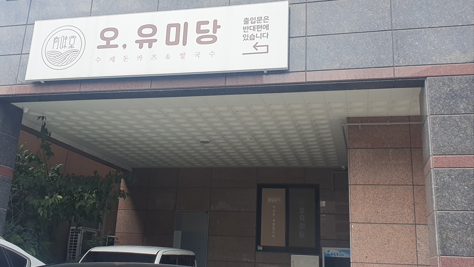 백설기처럼 하얗고 금빛으로 빛나는 예쁜 간판이 눈에 확 들어오는데요, 이곳이 바로 수제돈카츠&칼국수로 유명한 오유미당 이랍니다.