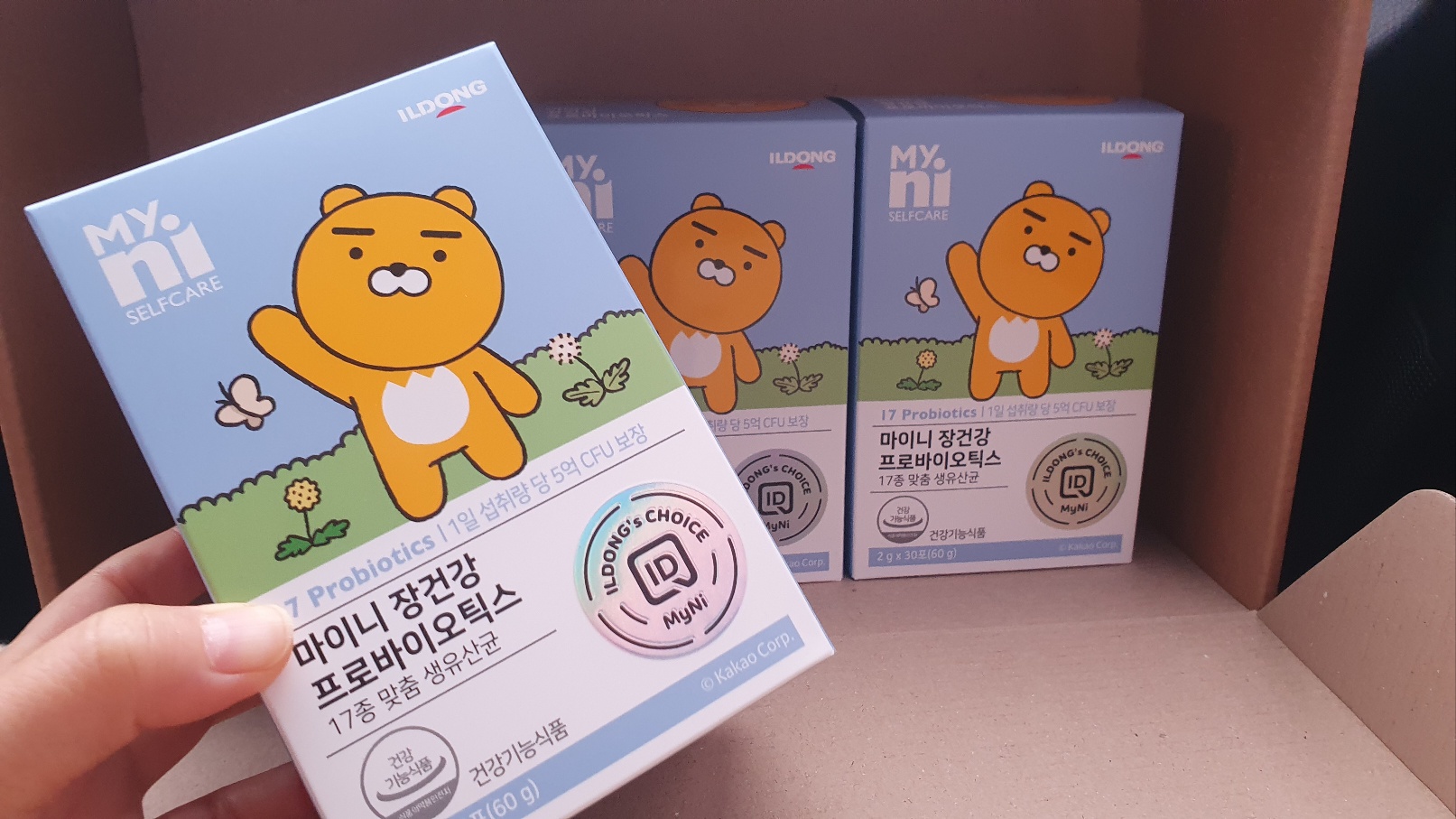 금연 성공 선물 상자를 열어보니 귀여운 라이언이 인사하고 있는 유산균 3박스가 들어있었습니다.